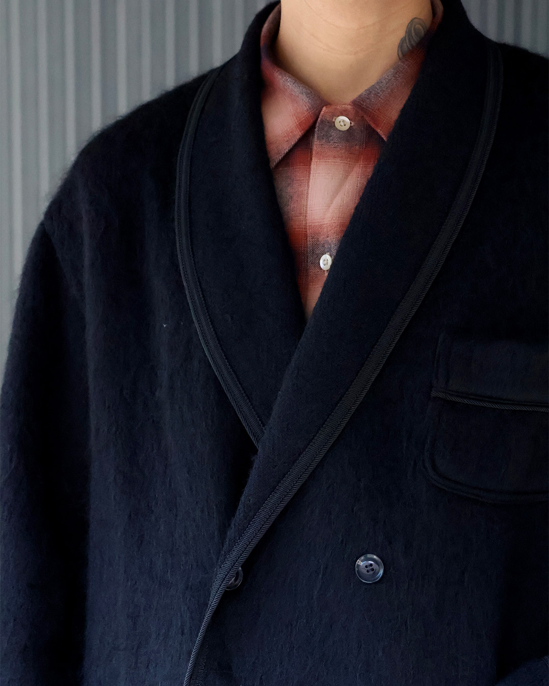 上質なモヘアシャギー素材を使用したダブルスモーキングジャケットになります。