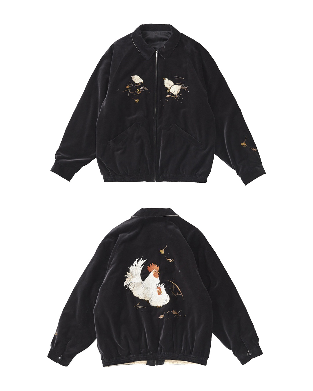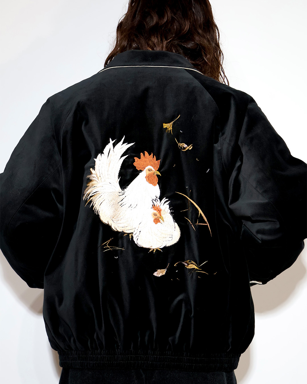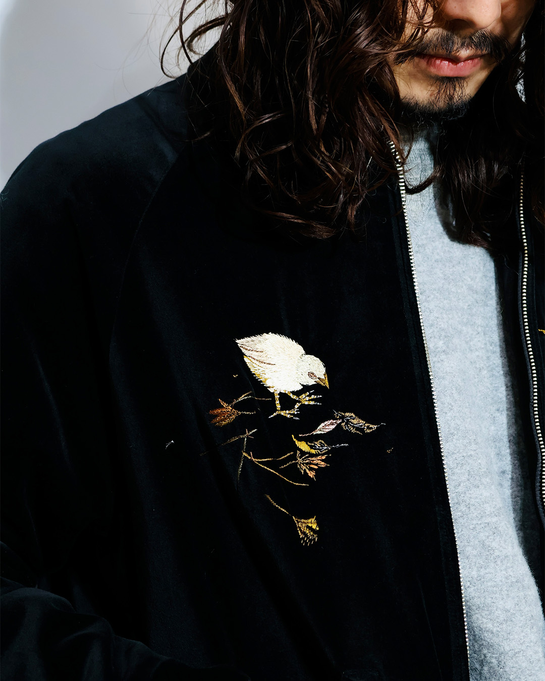 古き良き美しい日本の風景を刺繍したOLD JOEのジップブルゾン、STUNNING VELVET SOUVENIR JACKET(Niwatori to Hiyoko)です。