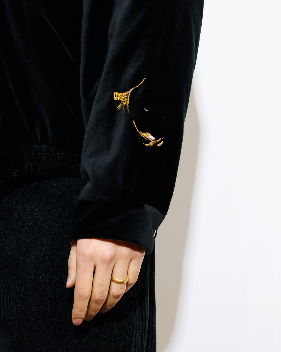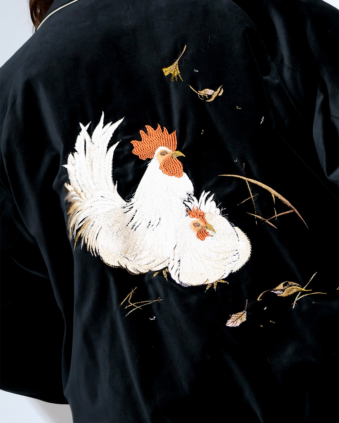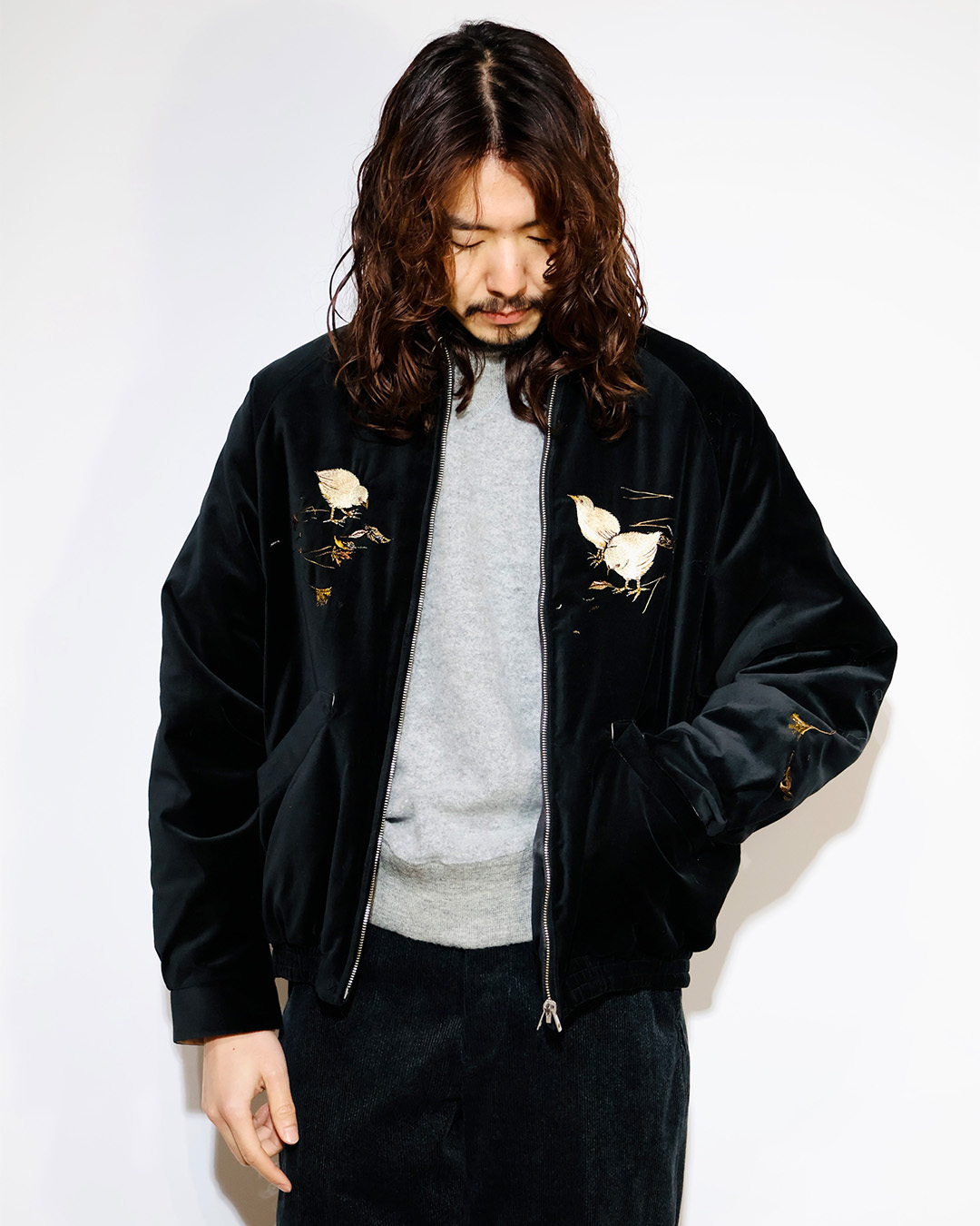 古き良き美しい日本の風景を刺繍したOLD JOEのジップブルゾン、STUNNING VELVET SOUVENIR JACKET(Niwatori to Hiyoko)です。
