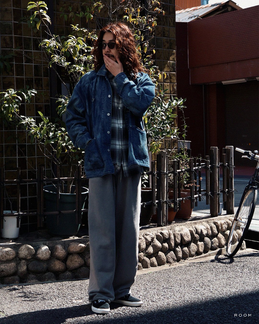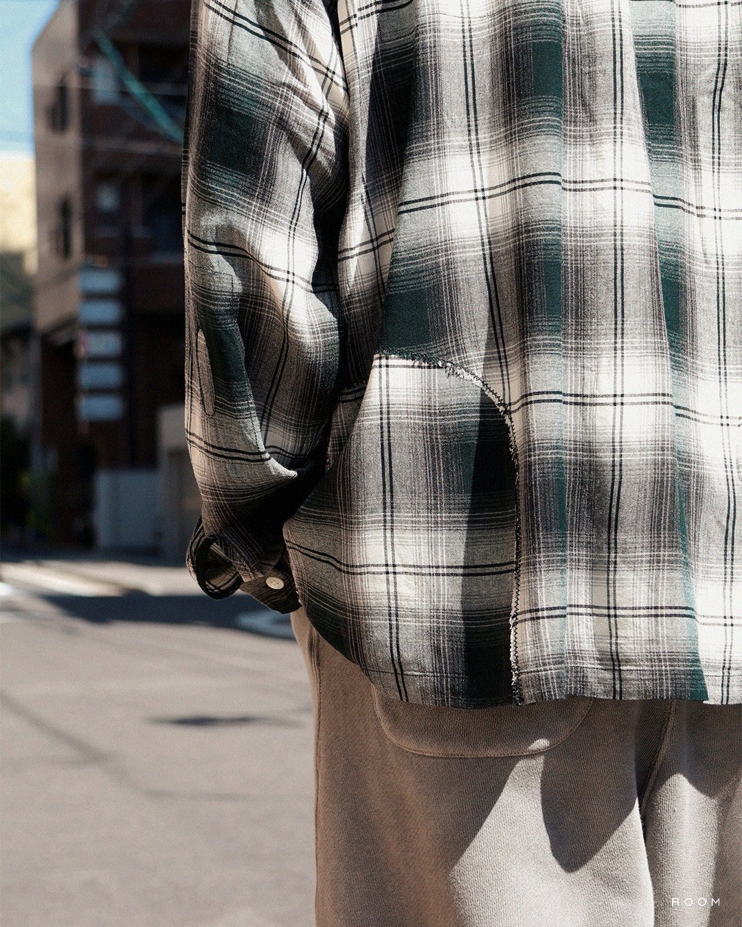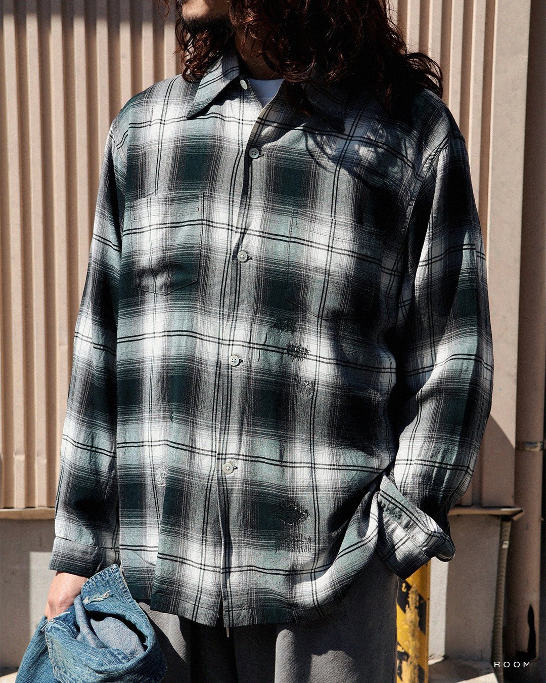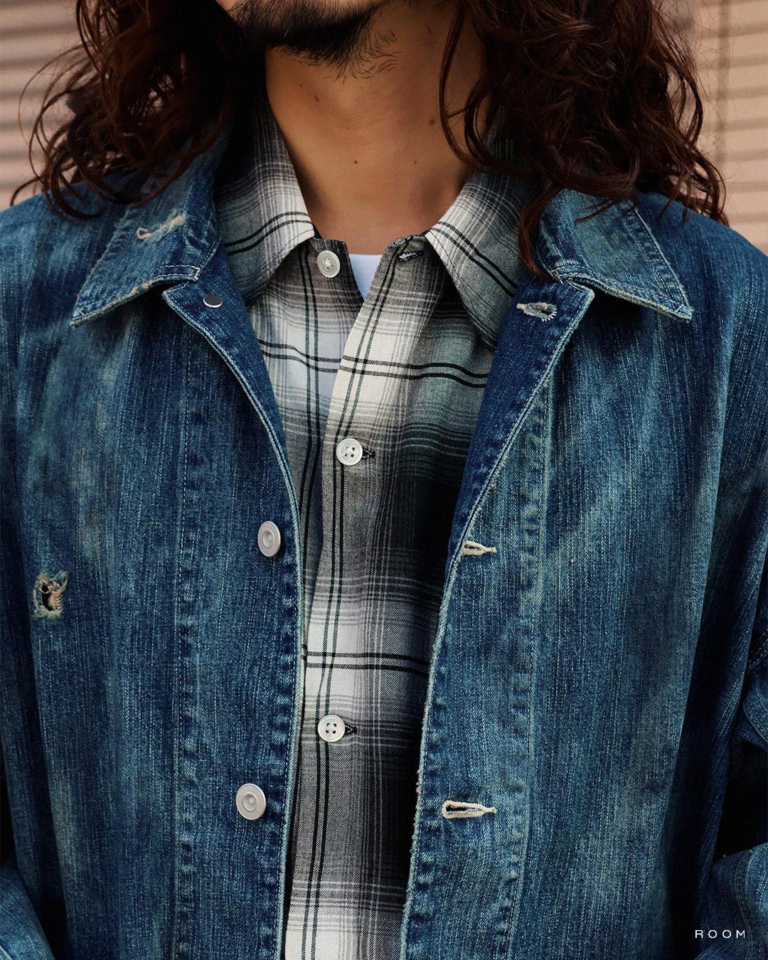 合わせたトップスはBOWWOWのREMADE RAYON PLAID SHIRT AGED。