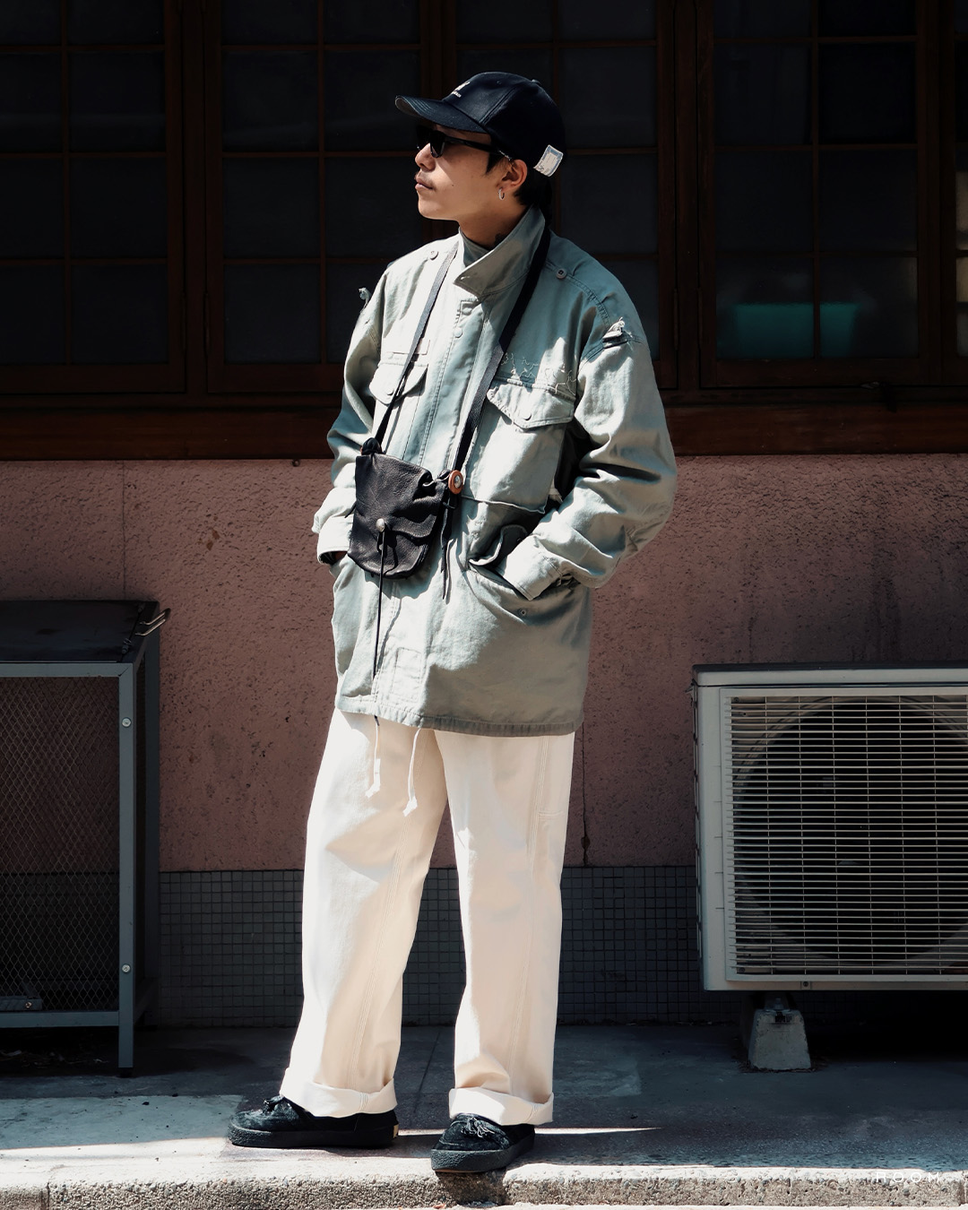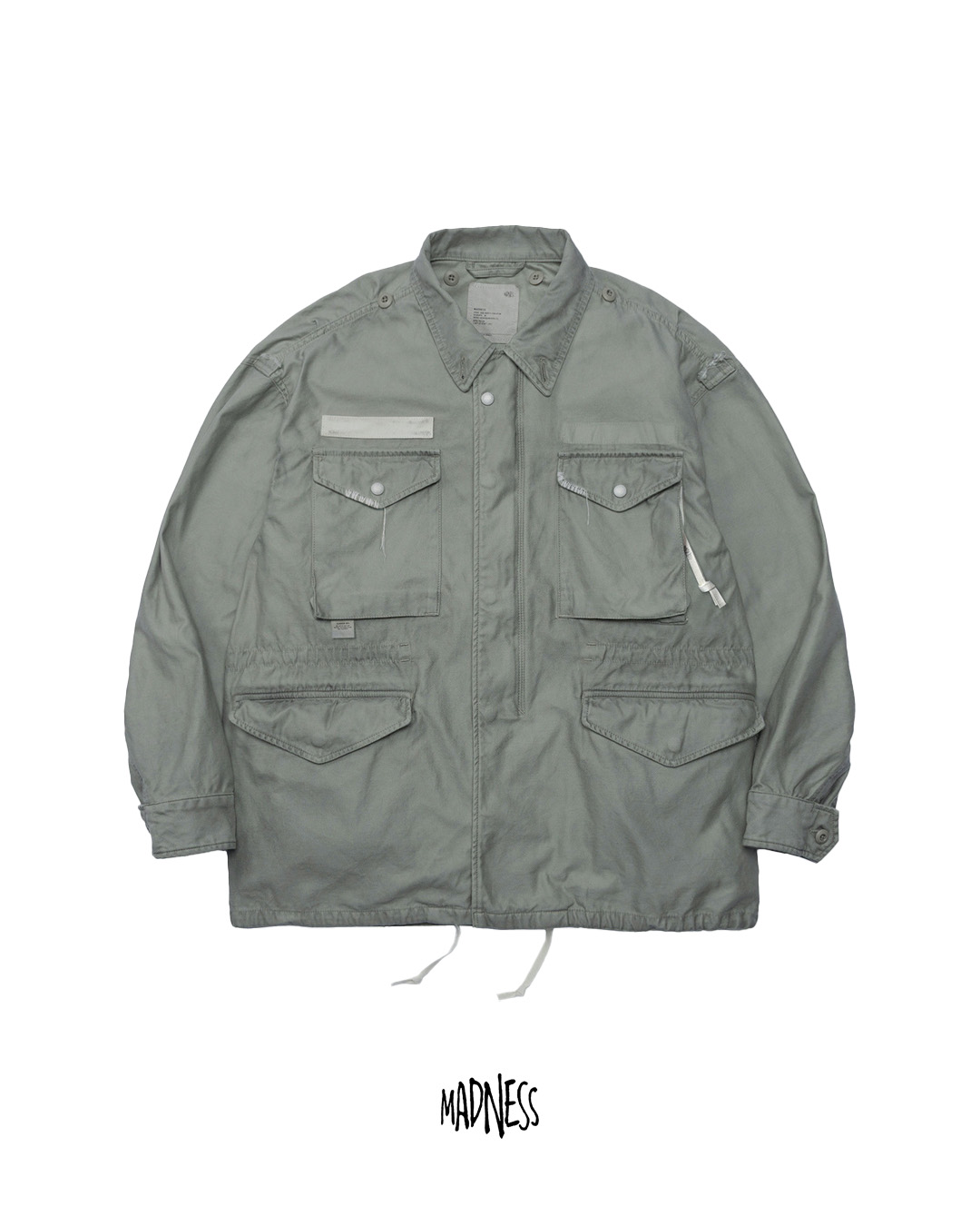 米陸軍で1950年代から65年まで採用されたフィールドジャケットをベースに、裾にスピンドルを追加、比翼内側はハーフジップ仕様、左胸ポケット外側にファスナーを追加、などMADNESSらしいアレンジを施したデザイン。