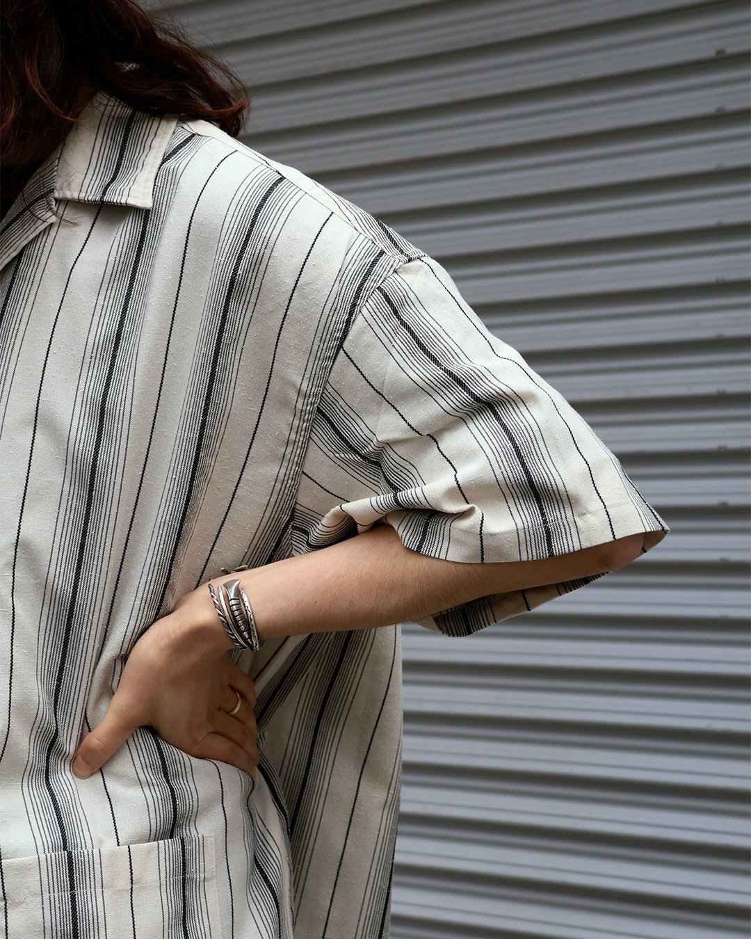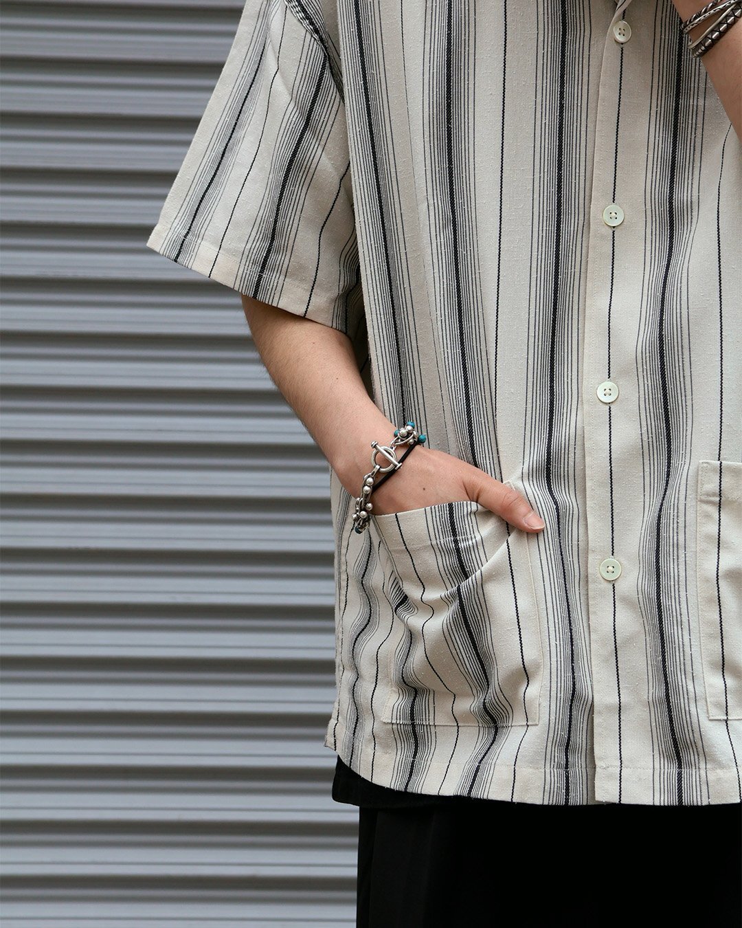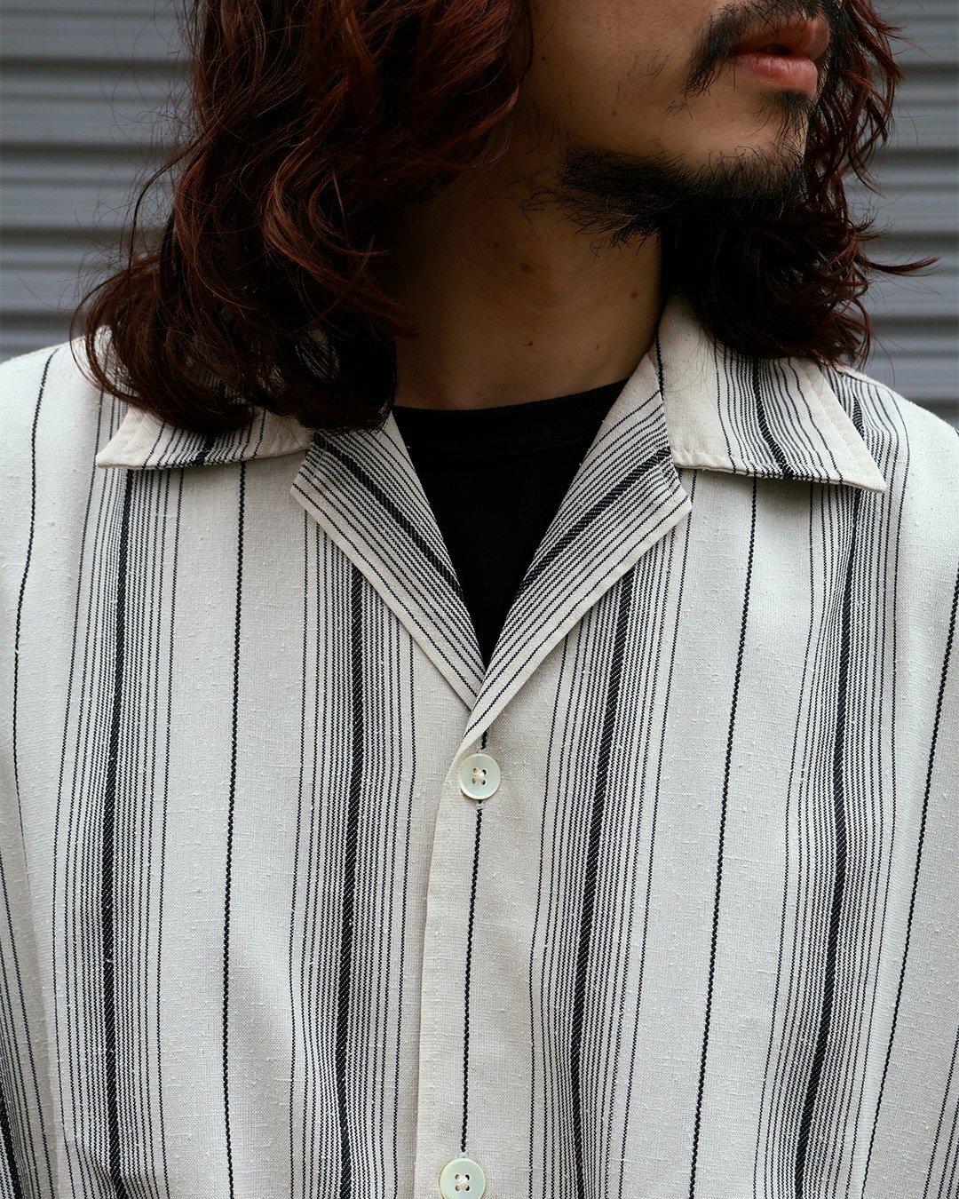 トップスはレーヨン、シルクネップ、ポリエステルの三者混ストライプ生地を使用したDobby Chain Stripe S/S Cavana Shirt。
