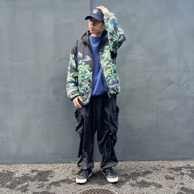 超ライトウェイトな撥水性の高いミニナイロンリップストップにピッチを大きくとったワンピッチのヤシの木の総柄パターンはRS社のアーカイブから抽出し、リサイジング。