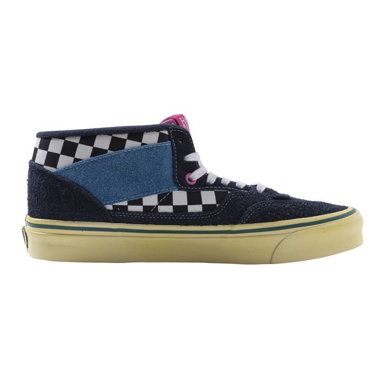 深みのあるネイビーのスウェードをベースにチェッカーフラッグにスカイブルーとビビッドなピンクの差し色が映えるインパクト溢れる一足。