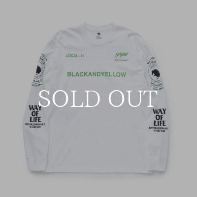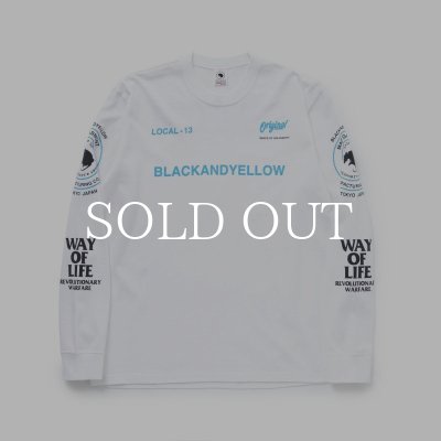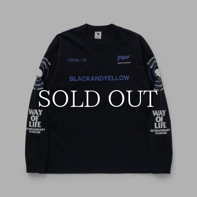 前身頃の胸元中央にBLACK&YELLOW、右胸にLOCAL-13、左胸にOriginal、両腕にサークル型RATモチーフとWAY OF LIFEのグラフィックをシンメトリーに配置したデザイン。