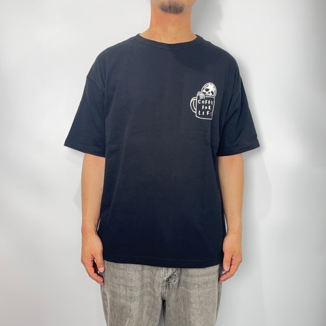 "COFFEE FOR LIFE"のメッセージを込めたスカルを胸元ワンポイントで落とし込んだデザイン。