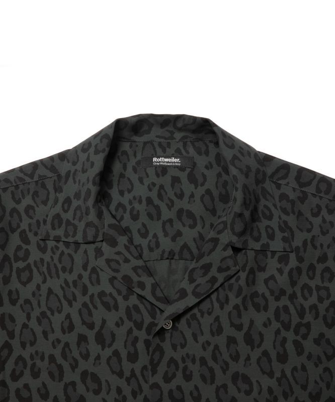 レーヨン100%のヒョウ柄生地を使用したショートスリーフ?オーフ?ンカラーシャツ。