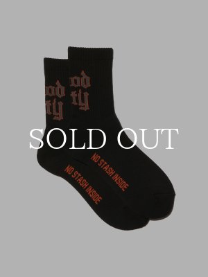 新柄のHOOD CITY柄のミッド丈ソックス。ふくらはぎ側にジャガードで”HOOD CITY”と入ります。