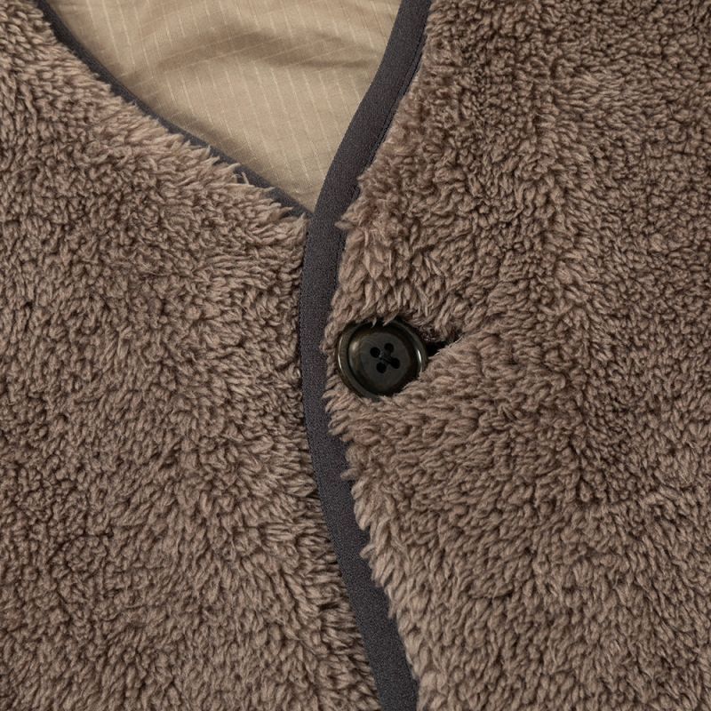 毛足が長いフリースを表地に裏地にはナイロンリップ、周りにはストレッチのパイピングを使用したベスト。