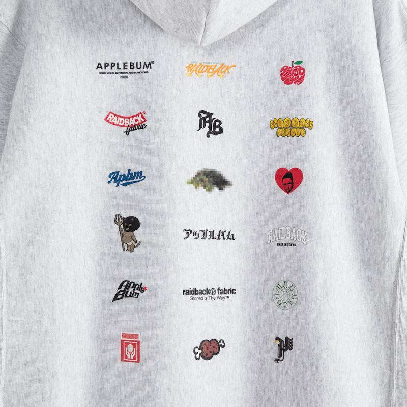 バックには【APPLEBUM】と【CRSB/raidback fabric】の様々なロゴやアイコンをランダムに配置したデザインをプリント。