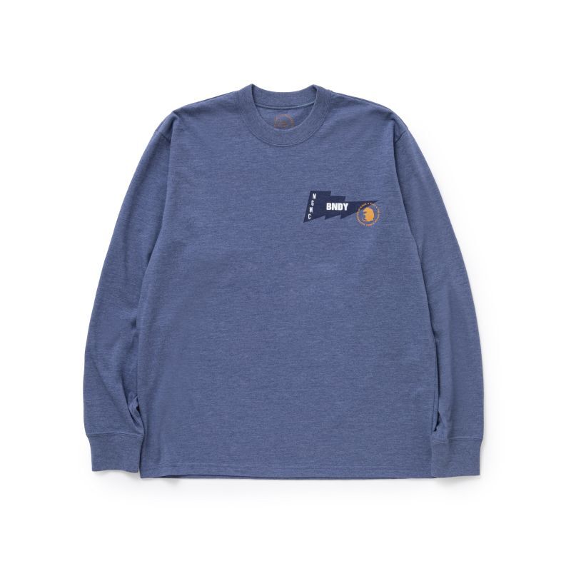 左胸にBNDY・MGMCのレターグラフィックをプリントしたサンダーモチーフを染み込みプリント、Ratモチーフ・サークル型のレターグラフィックをラバープリントで表現したデザイン。