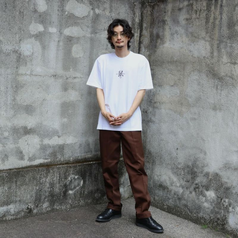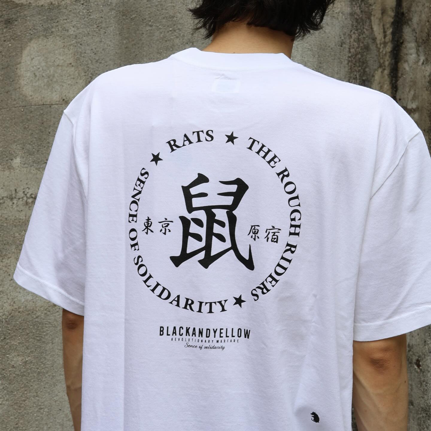 前身頃胸元に“鼠”・“東京・原宿”のレターグラフィック、背面に“鼠”・“東京・原宿”・サークル型に配置したレターグラフィックをラバープリント、背面右脇にRatモチーフをエンブロイダリー。