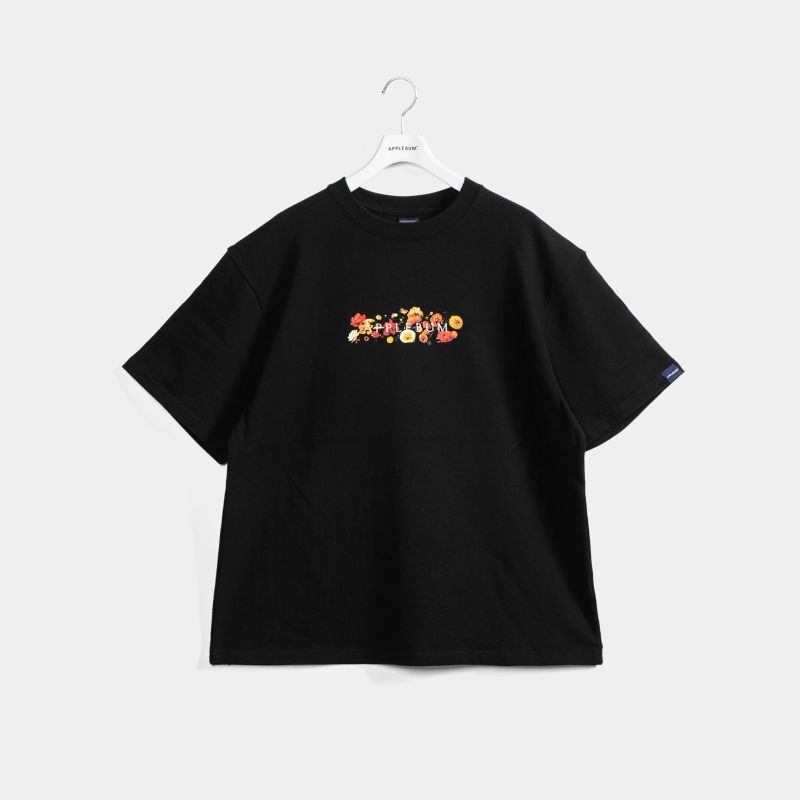 ランダムに配置した彩豊かな花々と【APPLEBUM】ロゴを落とし込んだTシャツ。