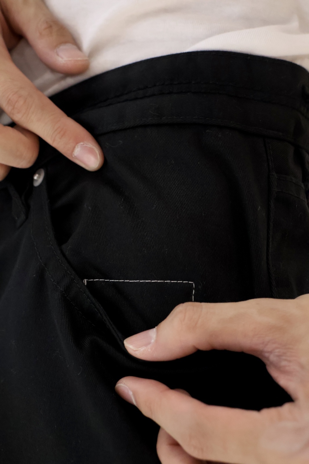 内側の両脇に裾からヒップにかけて通した紐を引っ張ることで、アウトシームが縮みレングスが伸縮し、独自のパッカリング生まれてシルエットの変更が可能なデザインです。