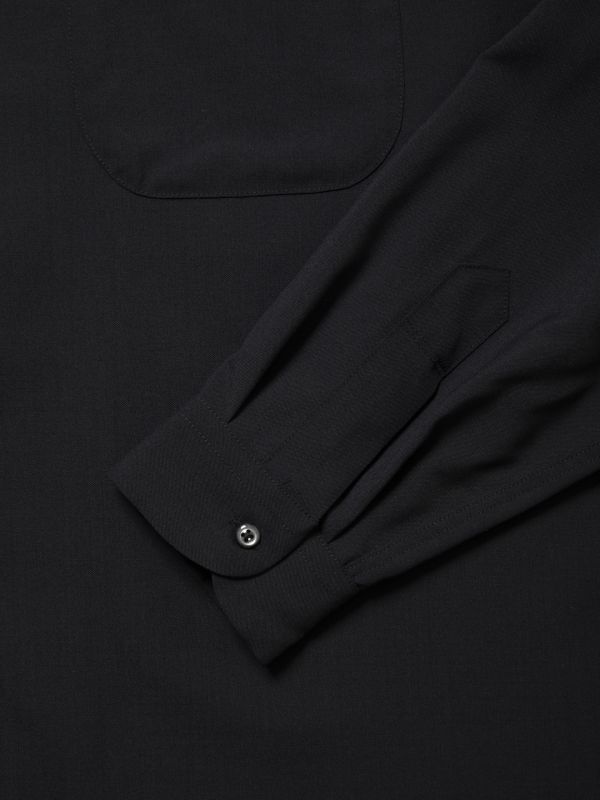 光沢とドレープが特徴のウールとポリエステル混紡のウォッシャブル平織生地を使用。