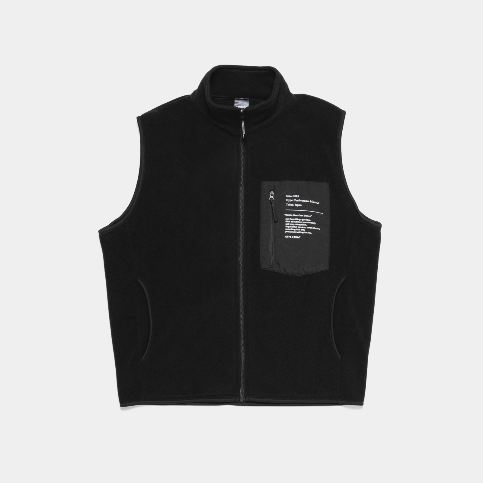 ポケット部分に【APPLEBUM】のロゴとメッセージをプリントしたフリースベスト。