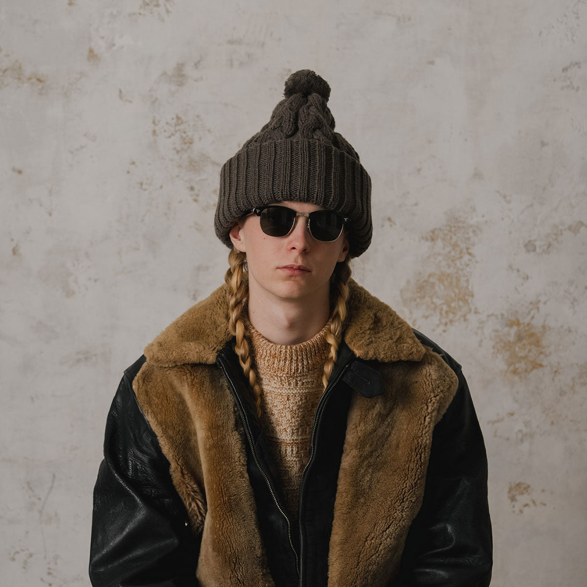 ケーブル編みと折り返しリブを組み合わせたオーソドックスなニットキャップで、ボリュームがあるデザインなので天井を弛ませて被るディティールとなっています。