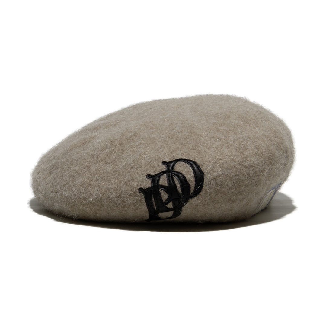 素材はウールアルパカで毛足のある温かみのある毛糸をフェルト化した生地を使用し、被って左横に『D』シンセティックレザーワッペンを3つ重ねたデザインとなっています。