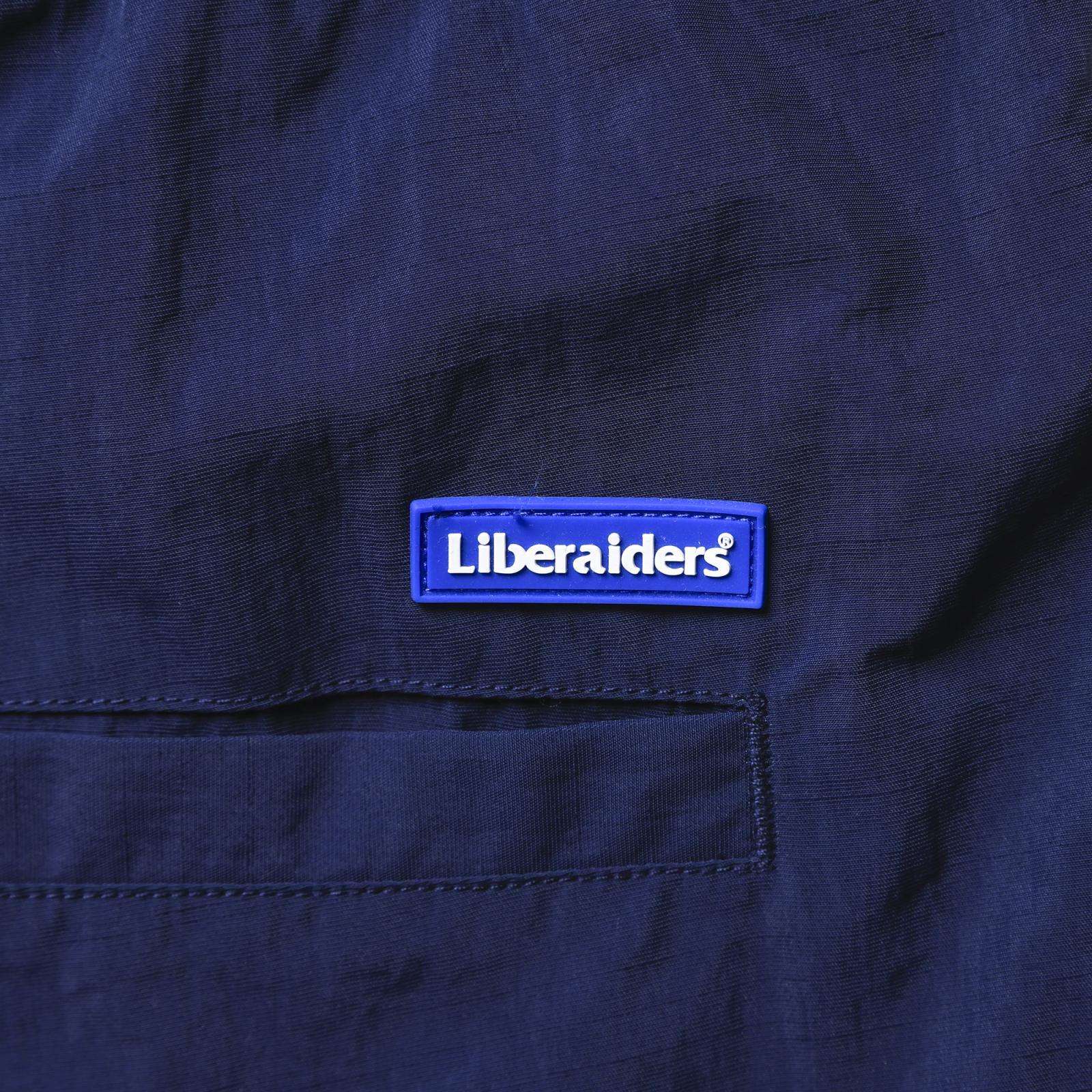 右腿にLiberaidersのカレッジロゴ刺繍、左腿には折り鶴ロゴ刺繍が入ります。