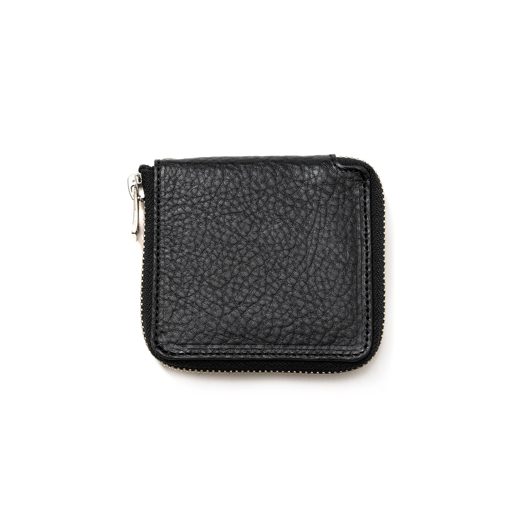 シボ感あるプレーンレザーにレザーパッチを施して作製されたラウンドジップタイプのショートウォレット。