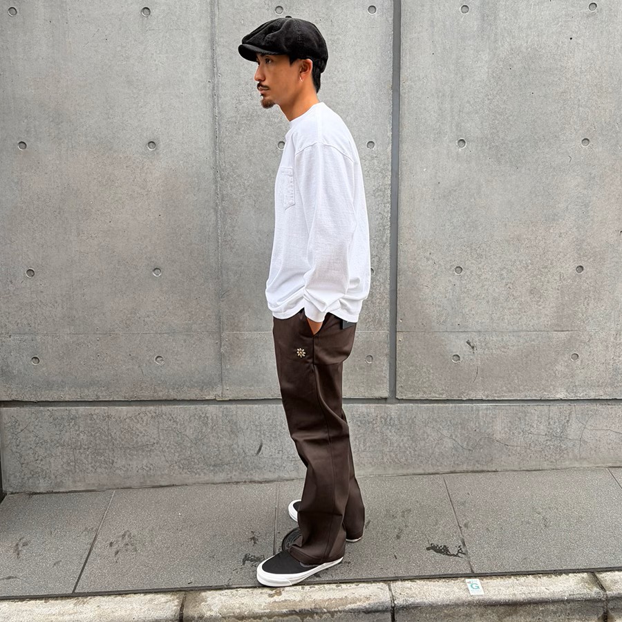 Dickiesの定番「874」に、フラワーデザインのスタッズを打ち込んでいます。