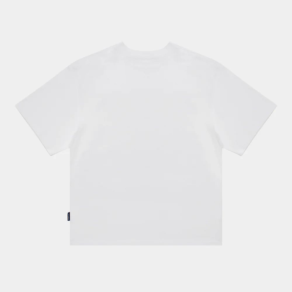 キャプションモチーフをプリントし、別生地グラフィックをラフに縫い付けた無骨な仕上がり。