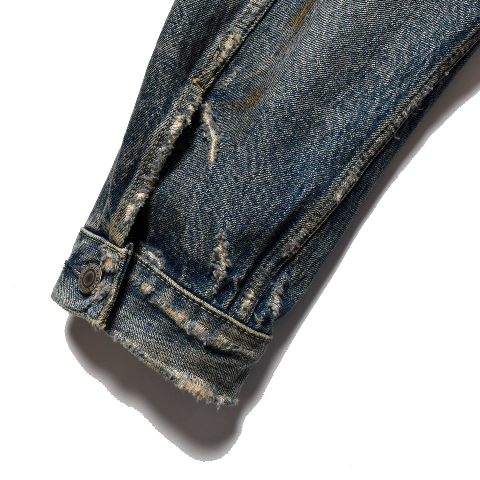 あえて生地を整理加工をしないことで当時のねじれや生地の風合いを再現した13.5ozインディゴセルヴィッチデニムを使用したビッグシルエットの1st型トラッカージャケット。