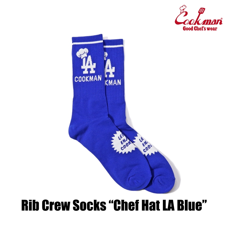 ロサンゼルスのイメージカラーでもあるドジャーブルー(Dodger blue)をテーマに、コック帽をかぶったLAロゴをあしらった、ほどよい厚みのデザインリブソックスです。