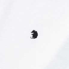 襟・袖を配色切り替えでバインダー付けしたトリムT仕様。前見頃にサークルグラフィックをエンブレム風に仕上げたモチーフをラバープリント、エンブレム外枠に微発泡プリントでステッチを表現したデザイン。