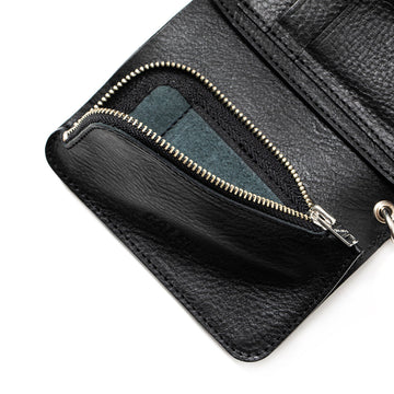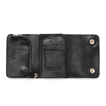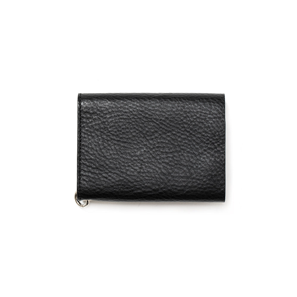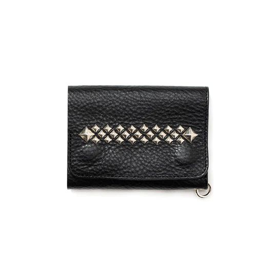 シボ感あるレザーにスタッズワークを施して作製された三つ折りタイプのハーフウォレット。