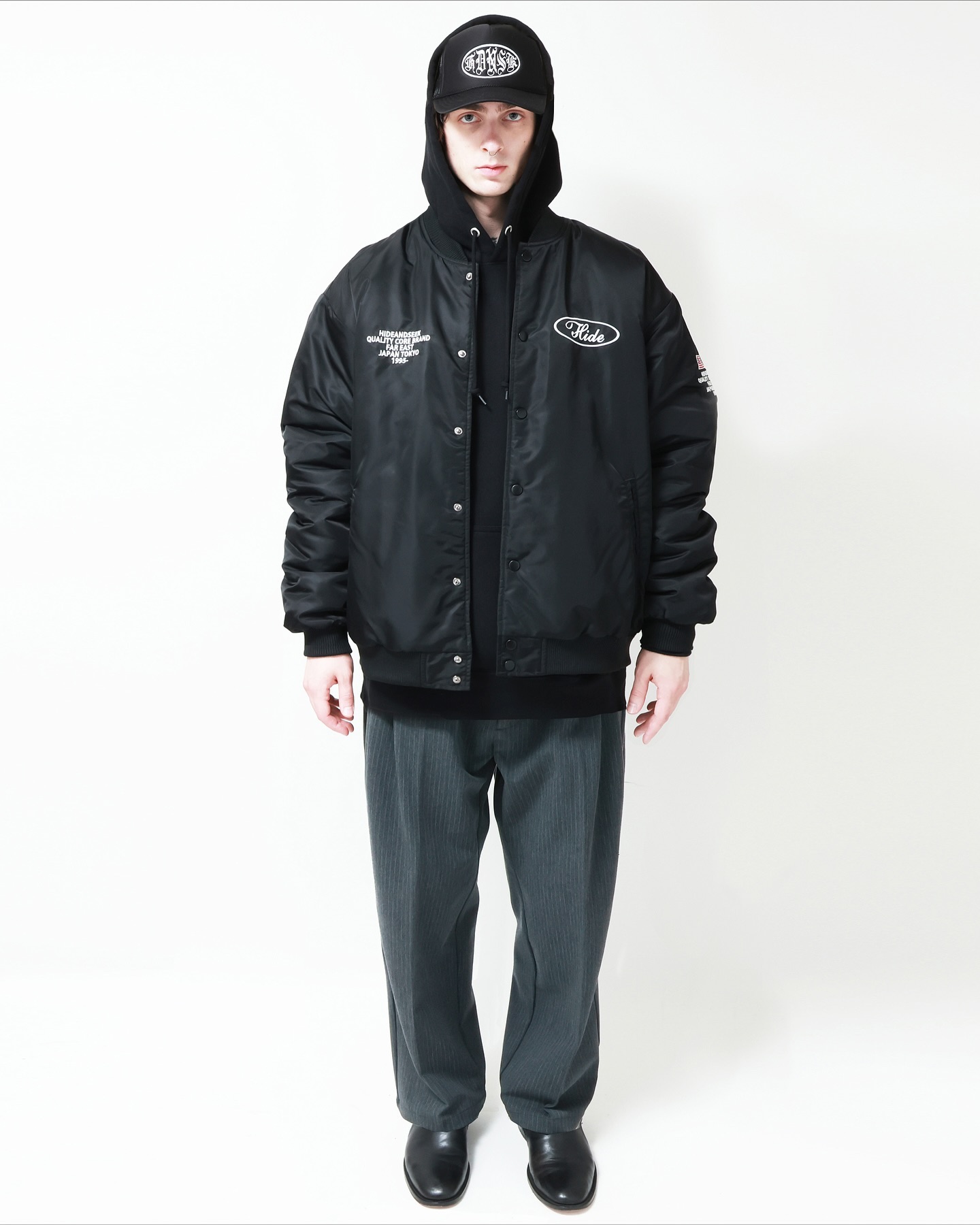 肉厚なサテンを使用、裏地にキルトを使用したスタジアムジャケットです。