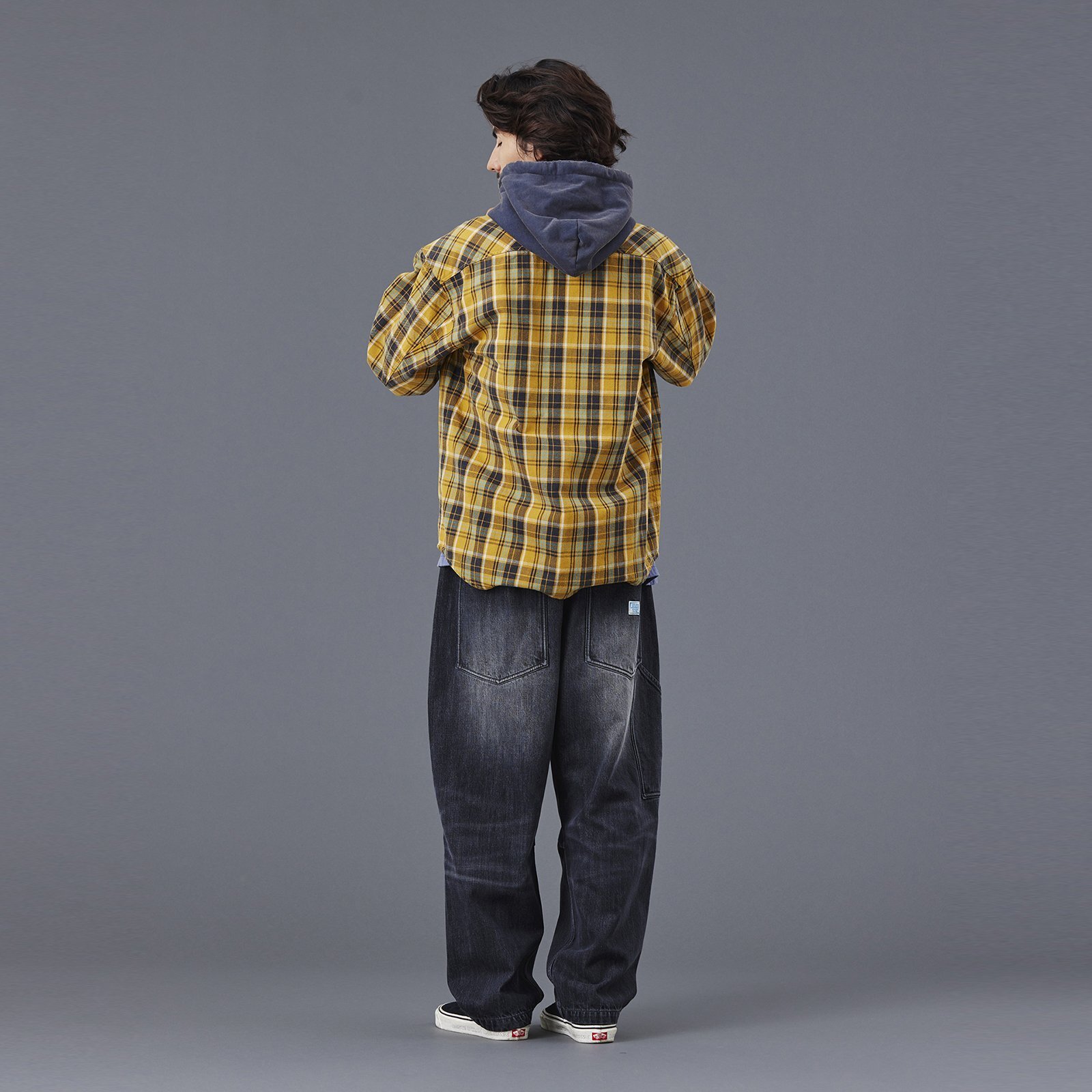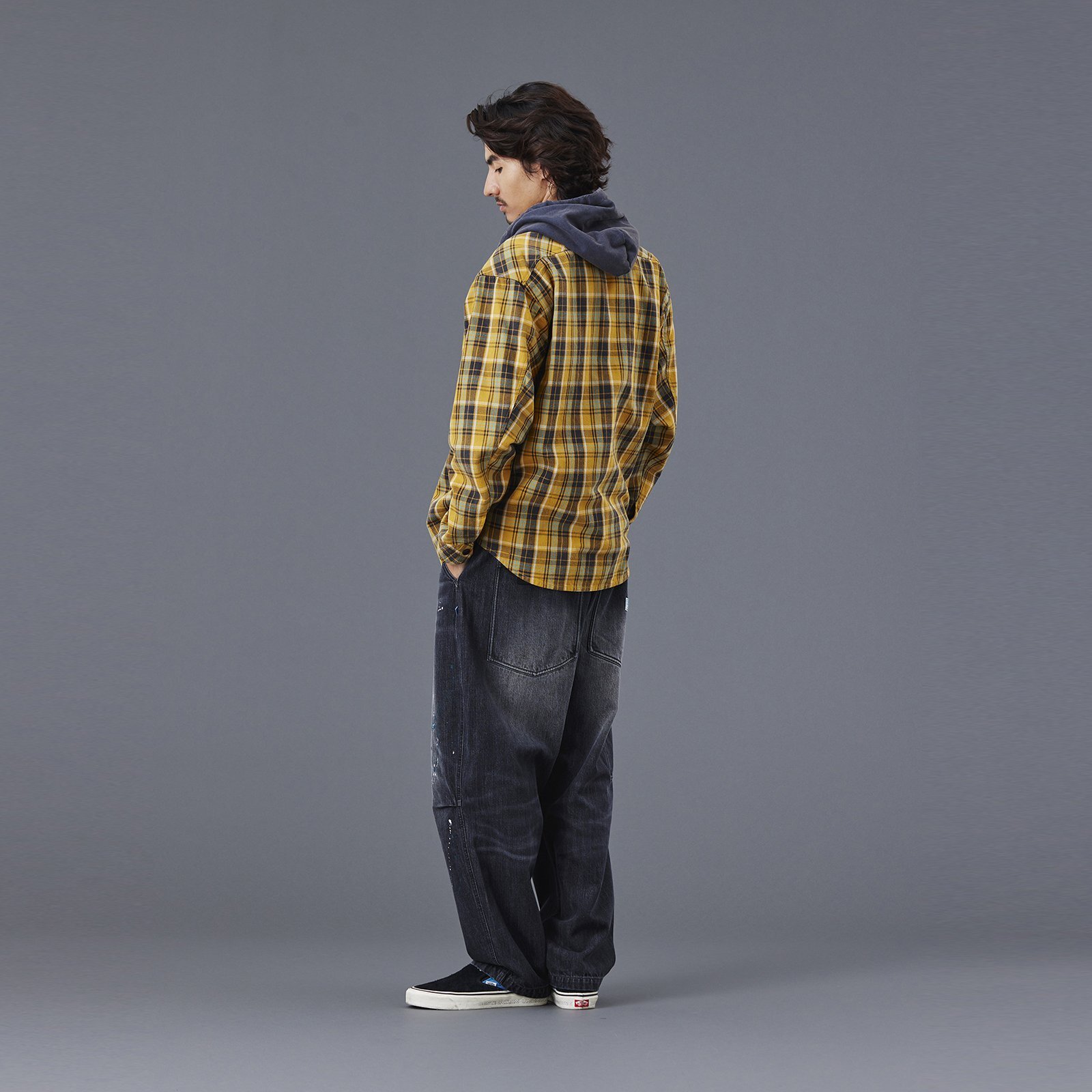 地厚なヘビーネルを使用し、フーディとのレイヤード風に裏毛のフードをドッキングしたシャツ。