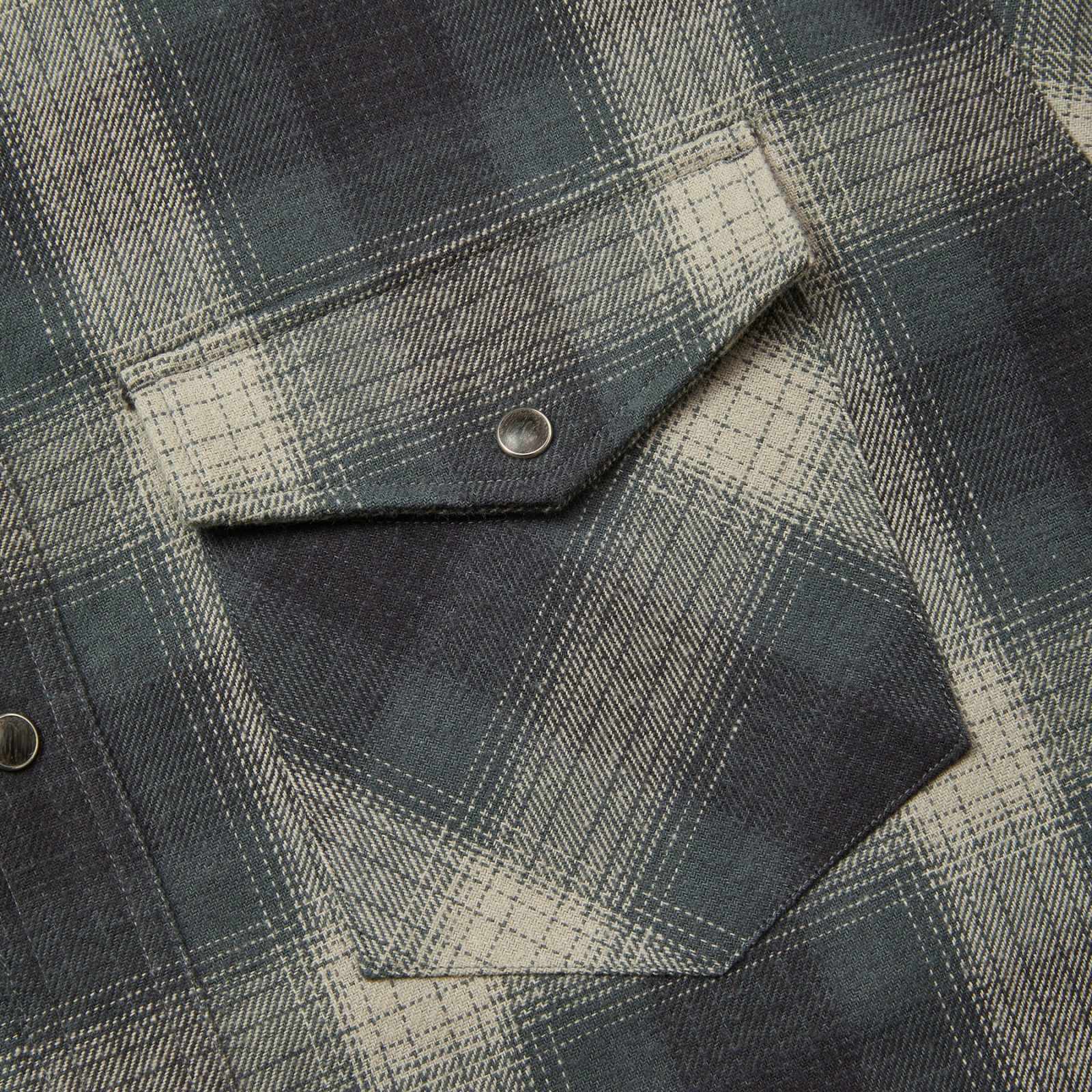 バックヨーク、フラップポケット、パールドットボタンなどのウエスタンディテール。