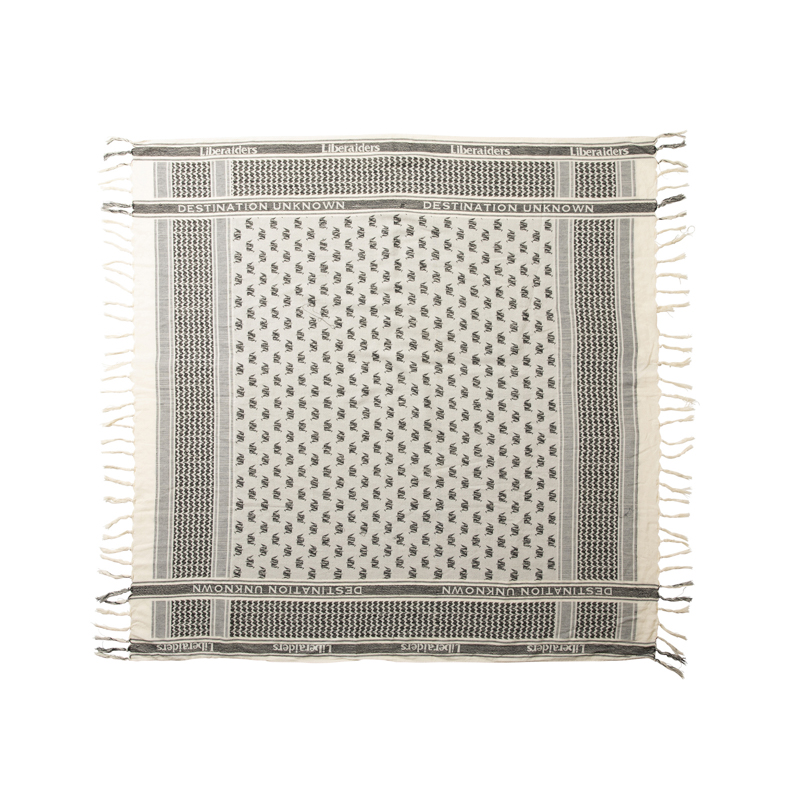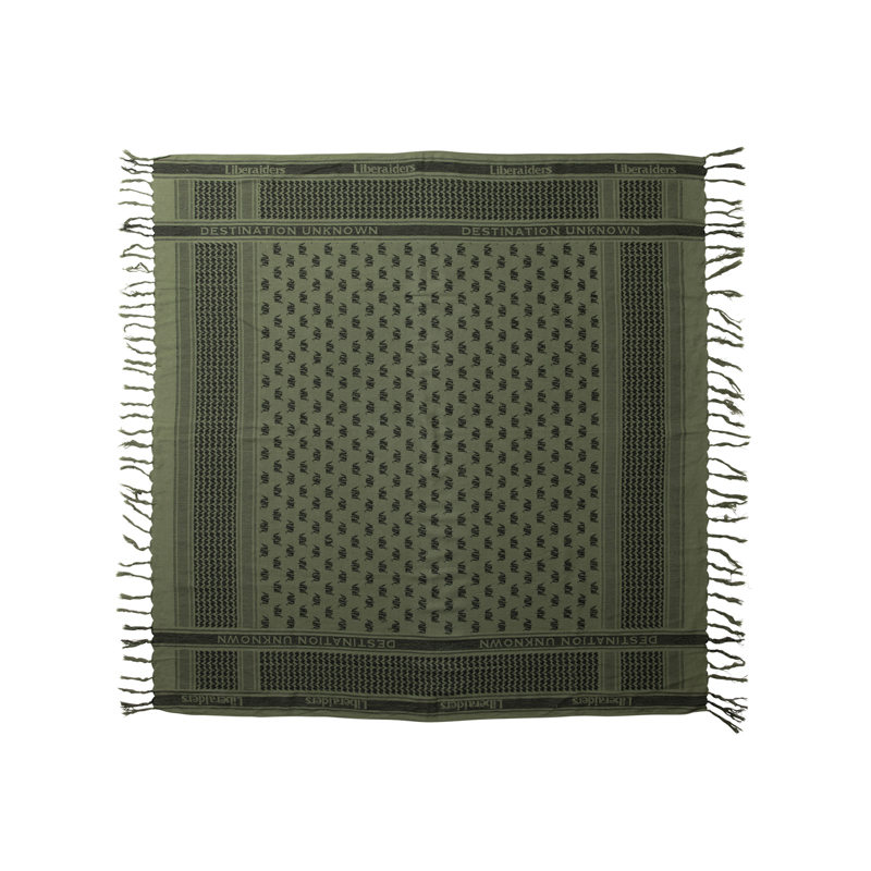 中心部分にはLiberaidersのアイコンである折り鶴を散りばめたこだわりの1枚首に巻く事はもちろん、頭から被って日除けに使うもよしの大活躍アイテム。