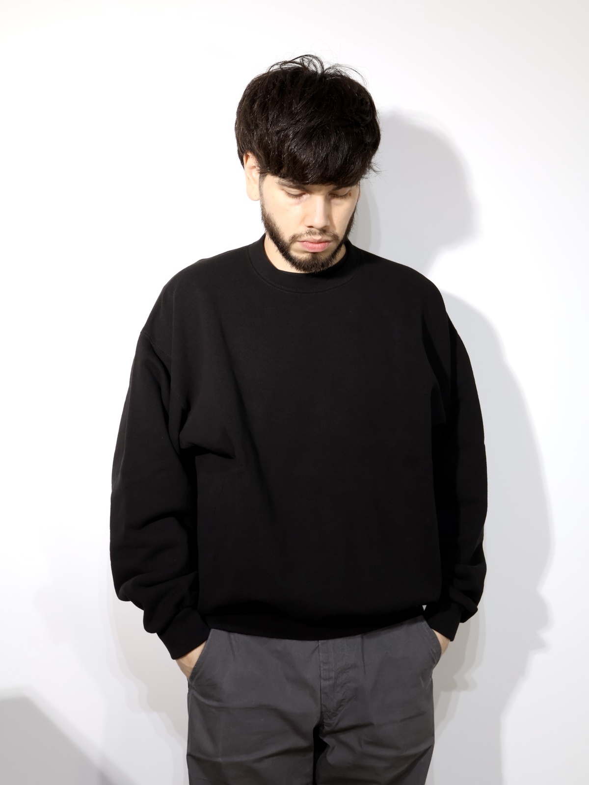 Vガゼット、サイドリブ仕様とビンテージスタイルを踏襲しつつ、フィットはMINEDENIMオリジナルのパターンにアレンジしたクルーネックプルオーバースウェットシャツ。