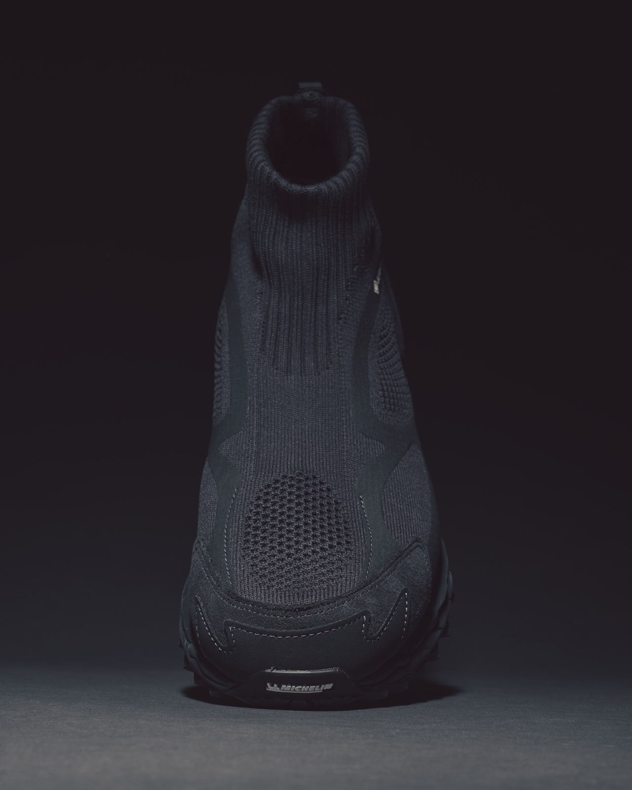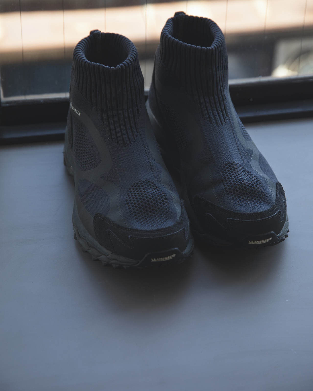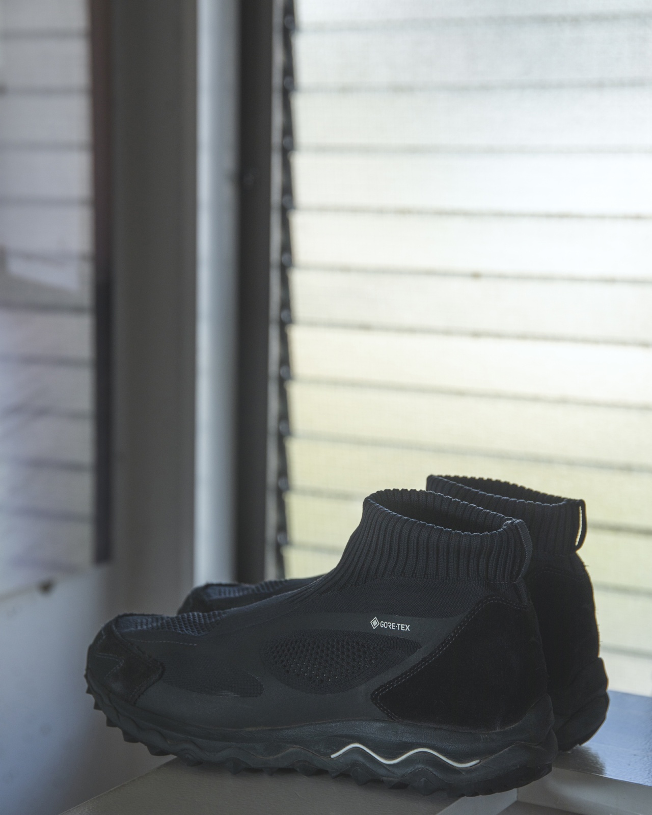 〈GORE-TEX〉プロダクトの防水透湿性能を備えながら、ニット素材特有の伸縮性があり着脱も容易なアッパー。
