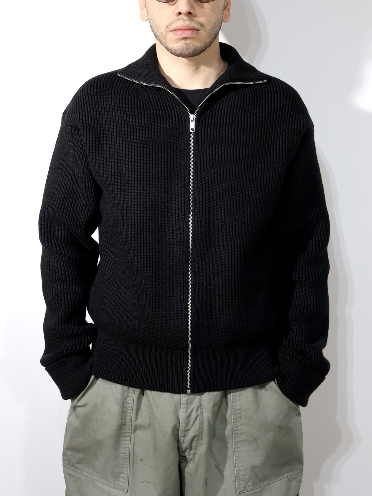 敢えて撚りをかけずコットン本来の柔らかな風合いと光沢を引き出した太番手のニット糸を用い、最大限度目を詰めることで重厚感を演したジップアップトラッカーニットブルゾン。