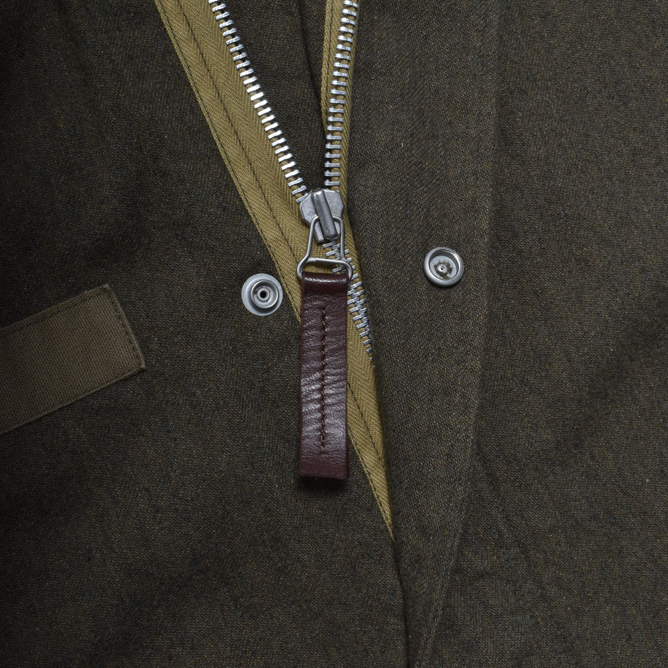 敢えてコットンウールファブリックで製作し、ファスナーやドローコードなどのパーツはもちろんのこと、補強布にレザーパーツを用いるなどオリジナリティも表現。