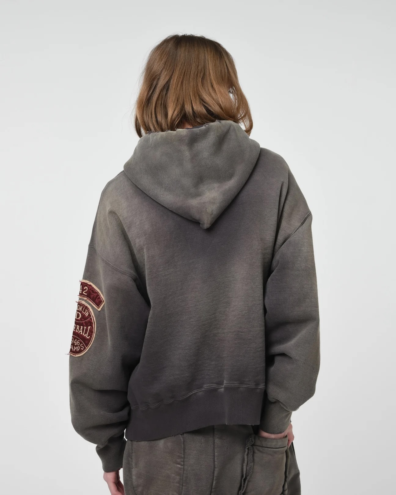 チームカラーのダークブラウンに映えるフェード、アタリ、擦れを重ねた着古し加工で、当時物さながらの存在感へ。