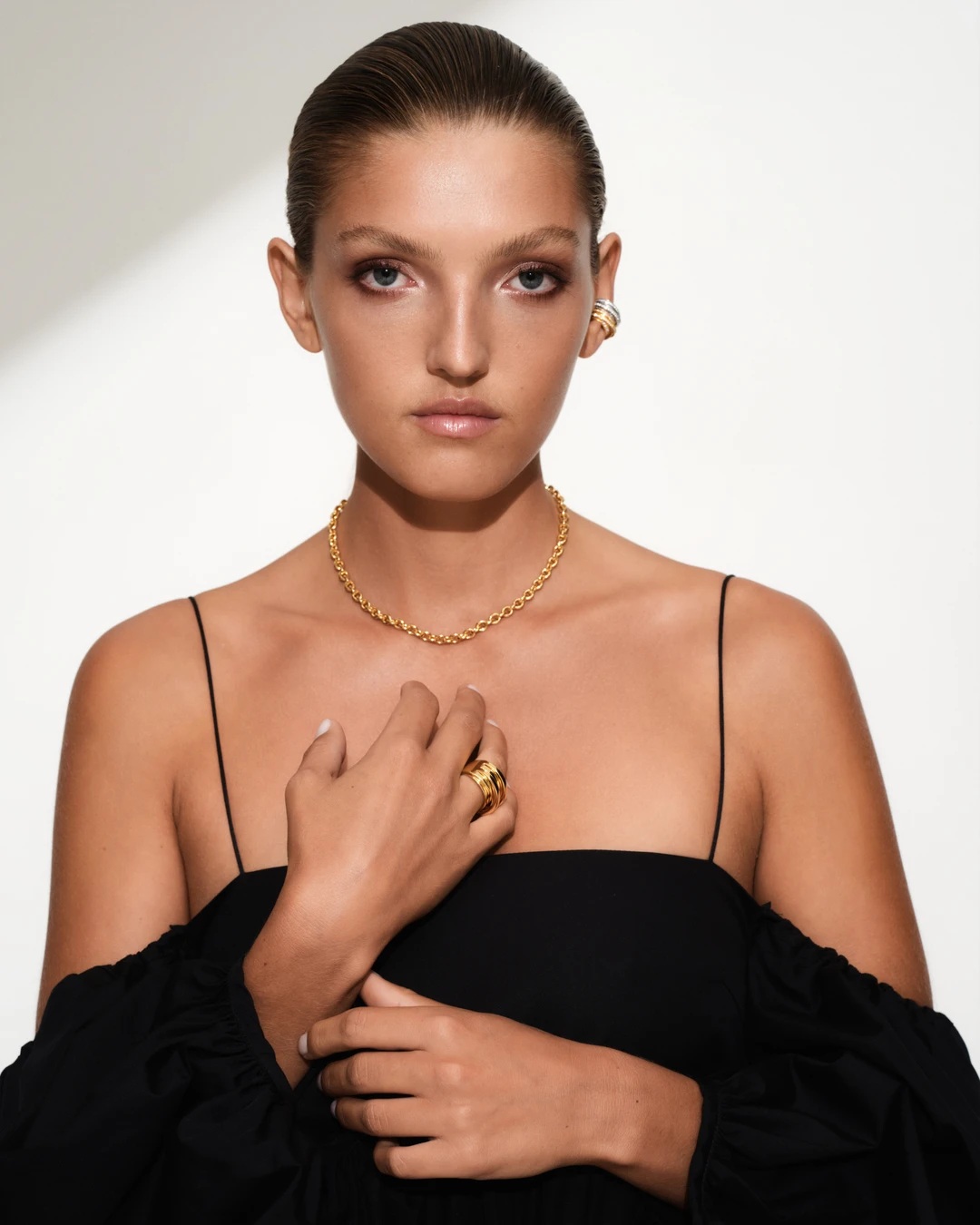 エイダ・チェーン・ゴールドは、トムウッドのカスタムデザインの留め具を使用した、丸くなめらかなチェーンです。