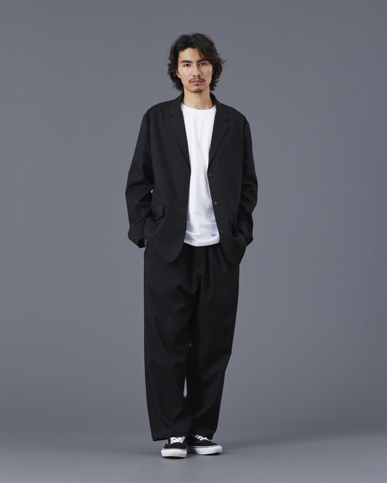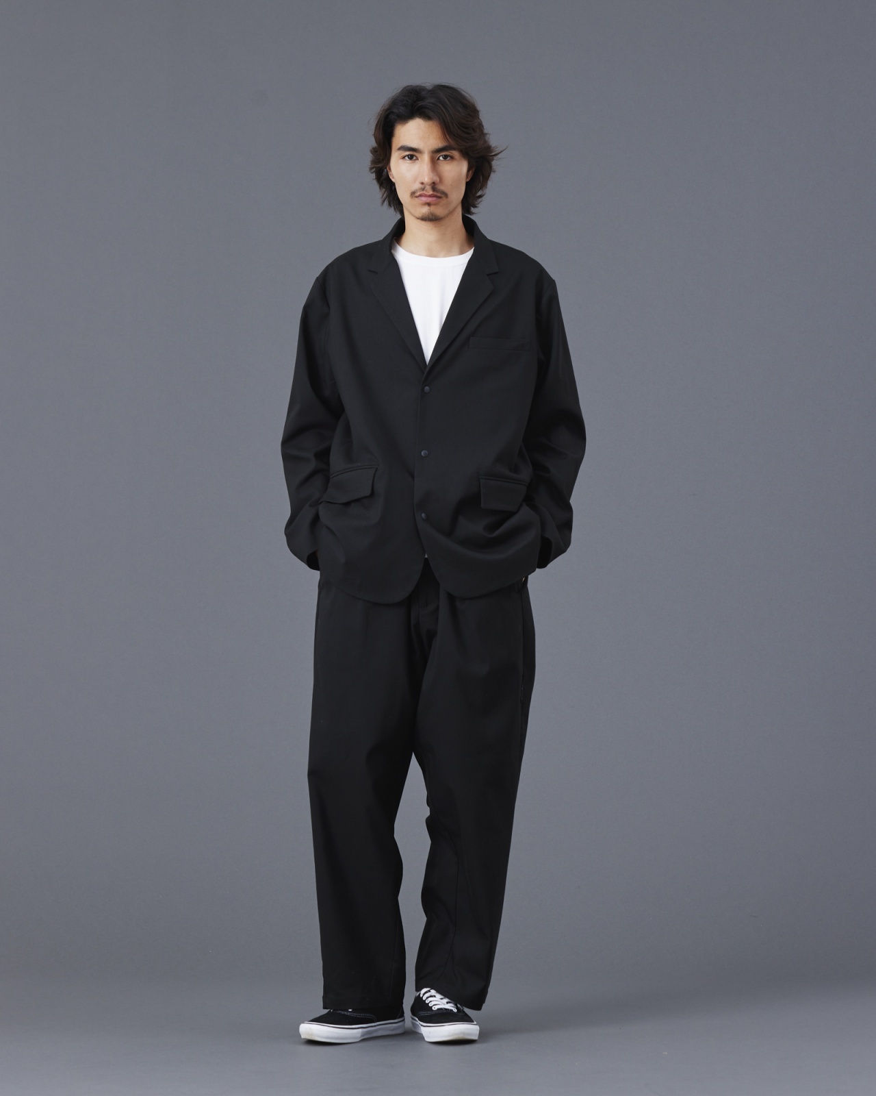 クラシックな印象のある3Bを程よくゆったりしたルーズシルエットに再構築したシルエットと高級感のある生地がポイント。
