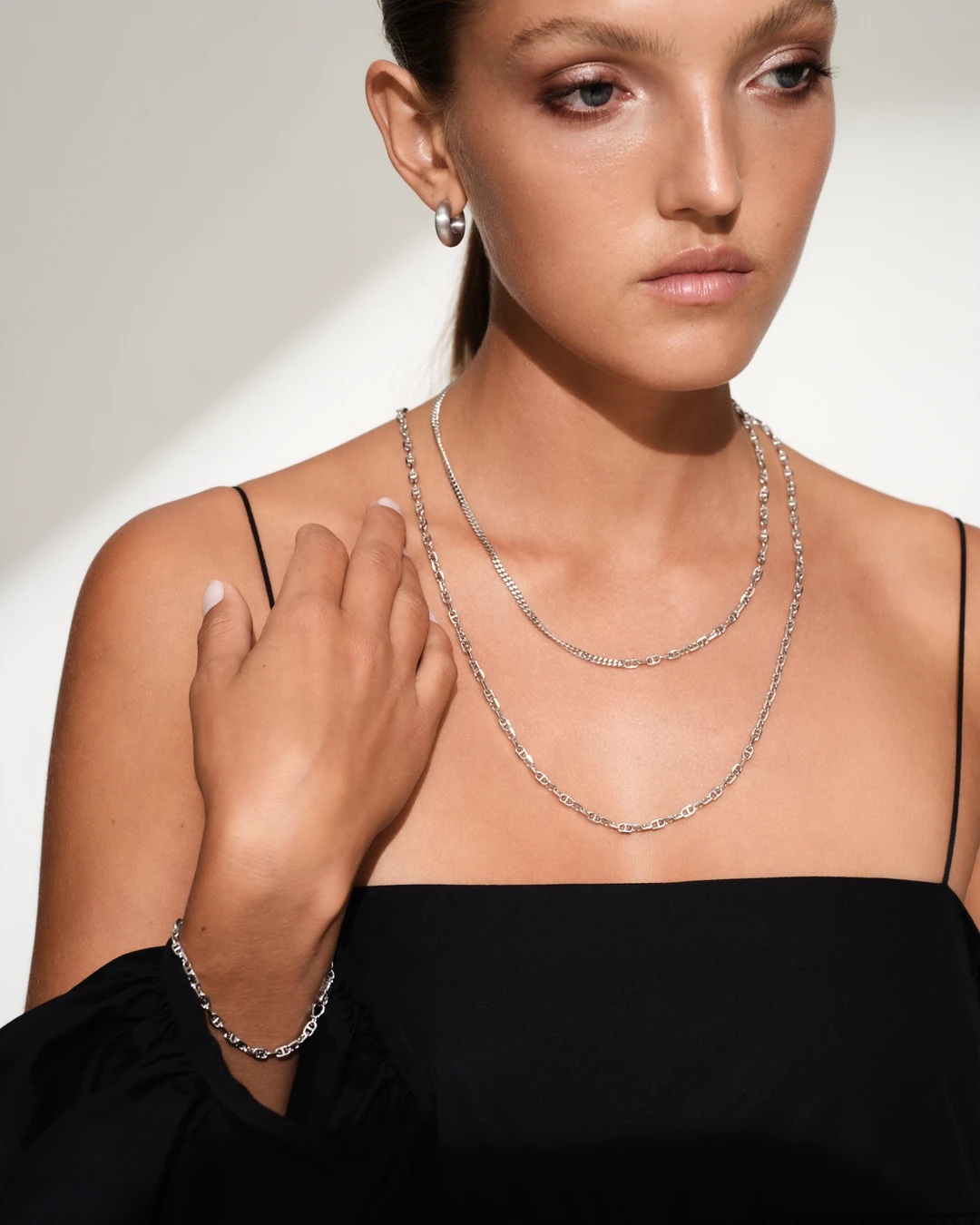 このブレスレットはポリッシュ仕上げのスターリングシルバー925製で、表面を強化し変色を防ぐためにホワイトロジウムプレーティングが施されています。
