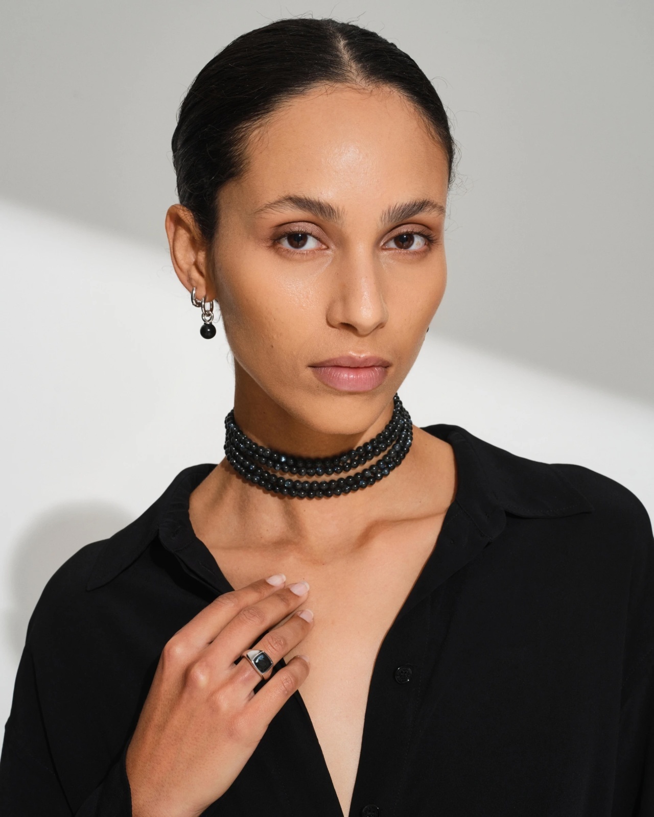 Made with 925 sterling silver in a polished rhodium plating and black larvikite.