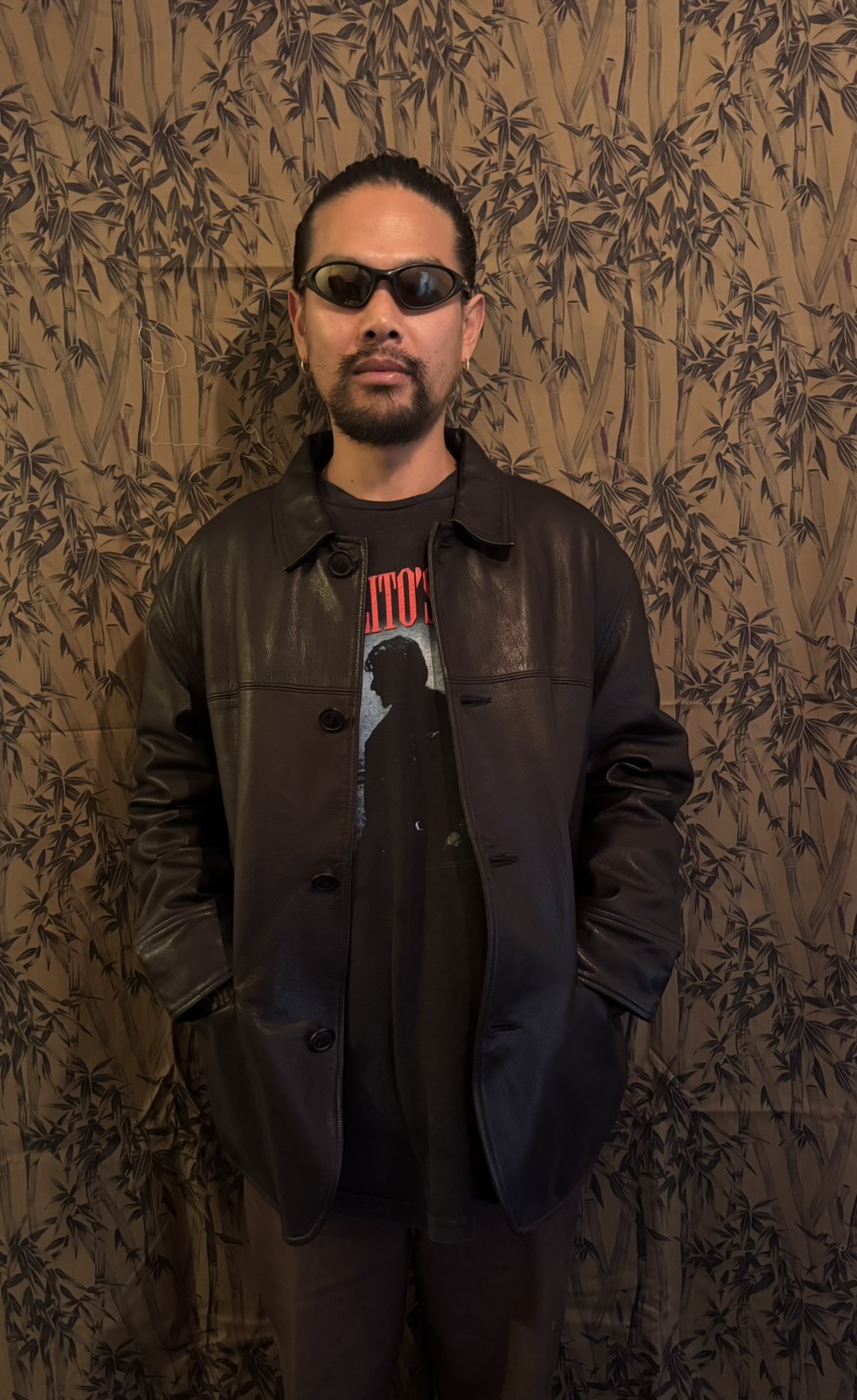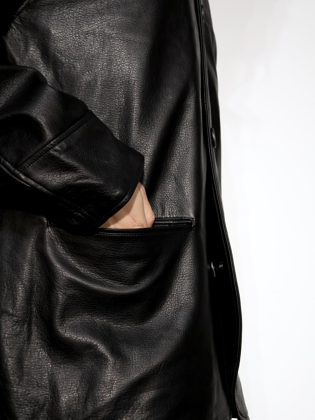 カウハイドを使用した少し丈短なレザーハーフコート。