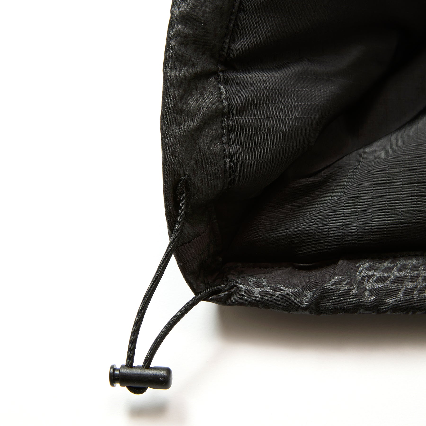ポリエステル/ナイロンツイルを特殊加工で極限まで密度を高めて製作した生地に、横浜手㮈染にてウレタン樹脂に黒顔料を混ぜプリント。