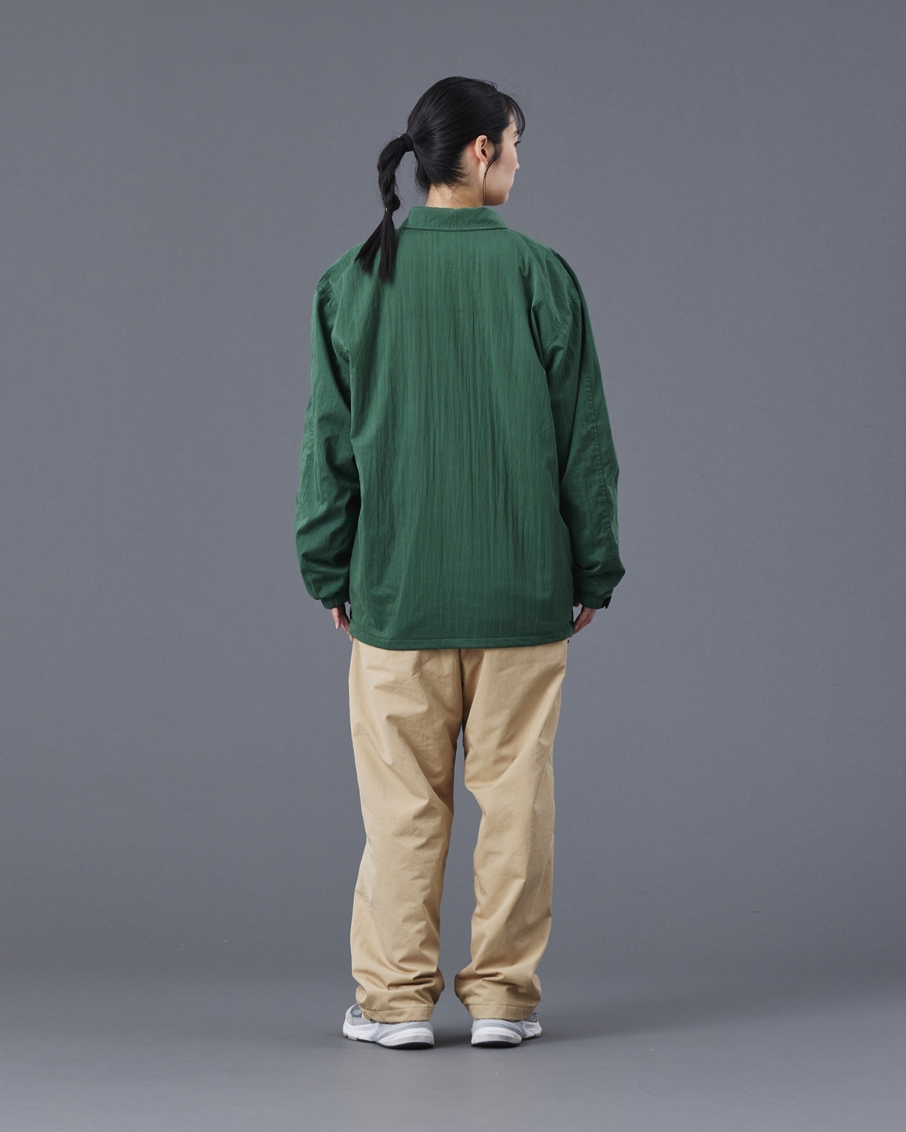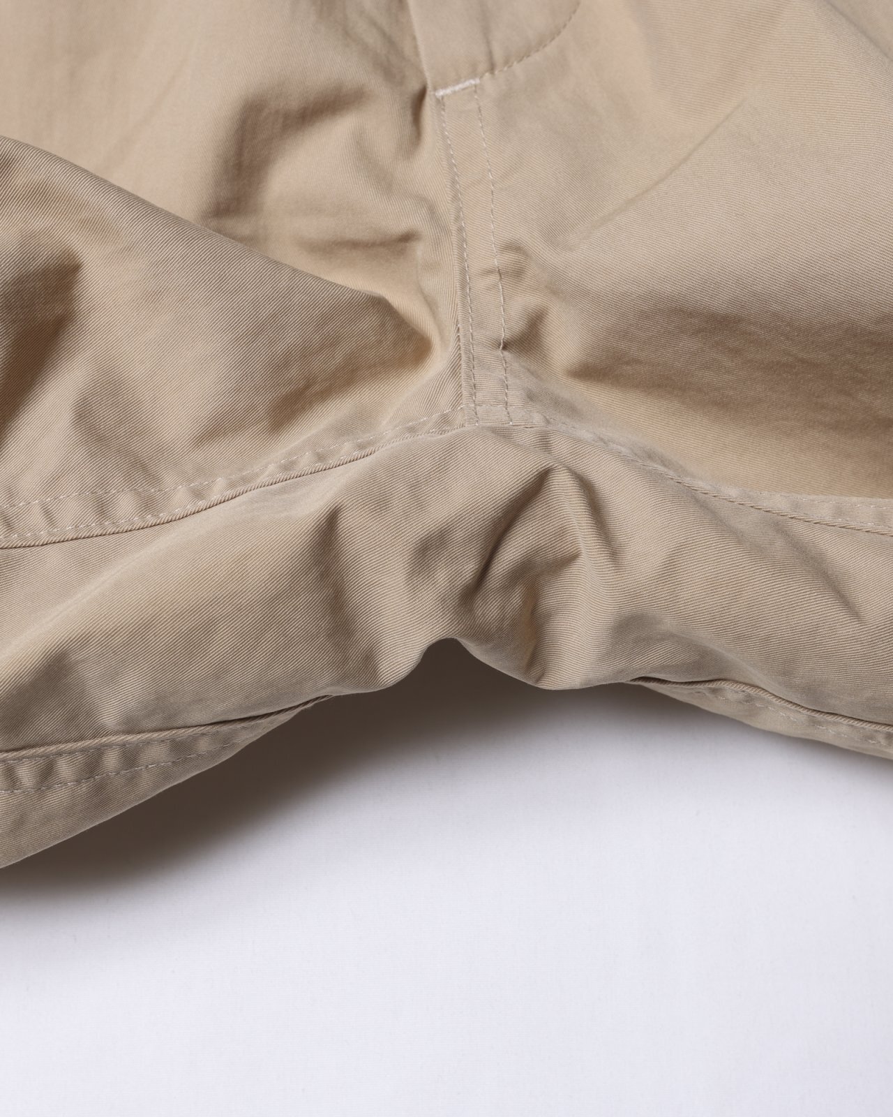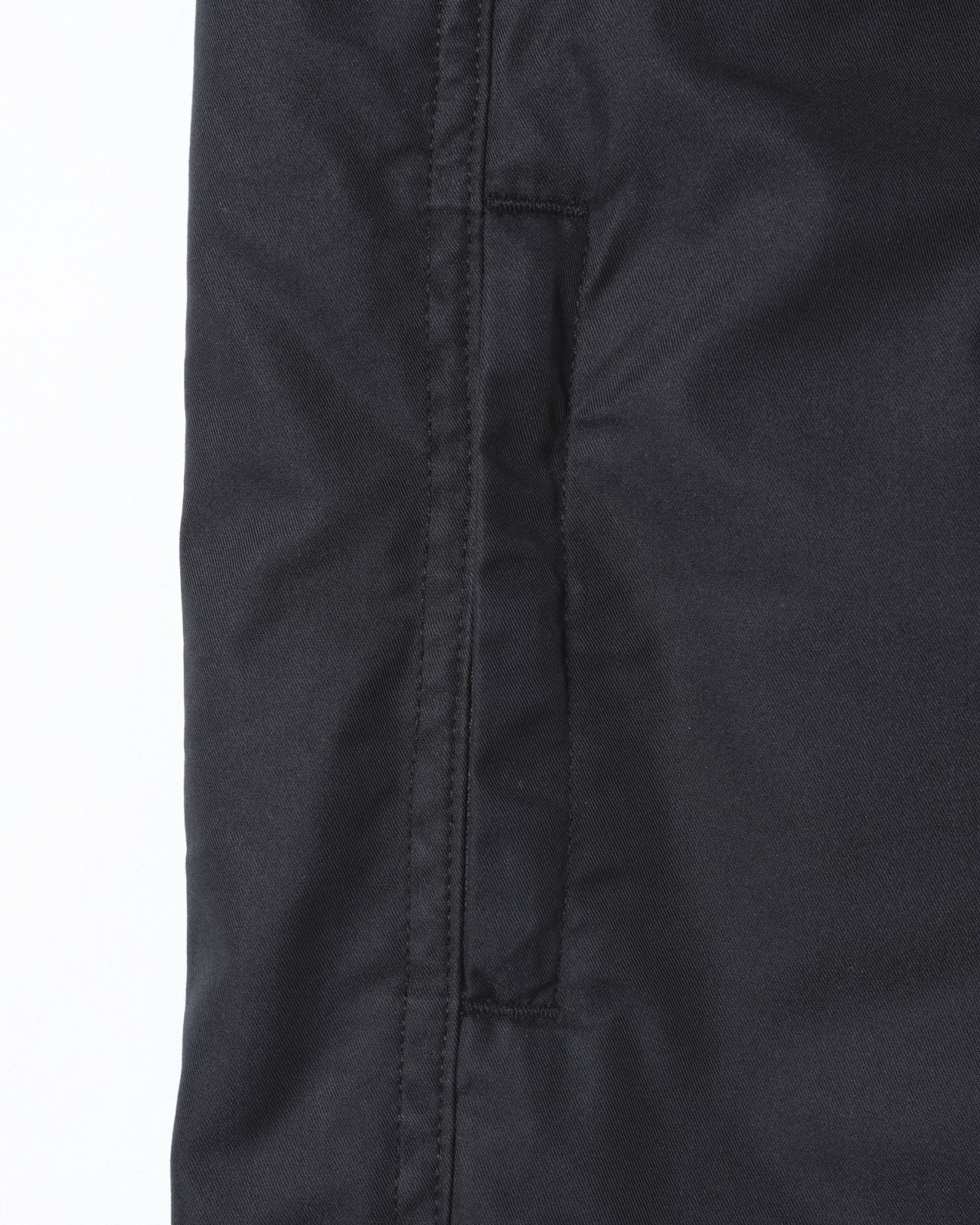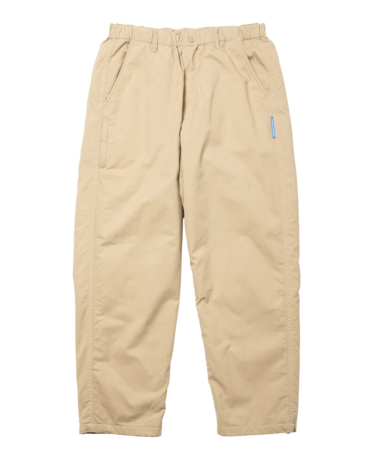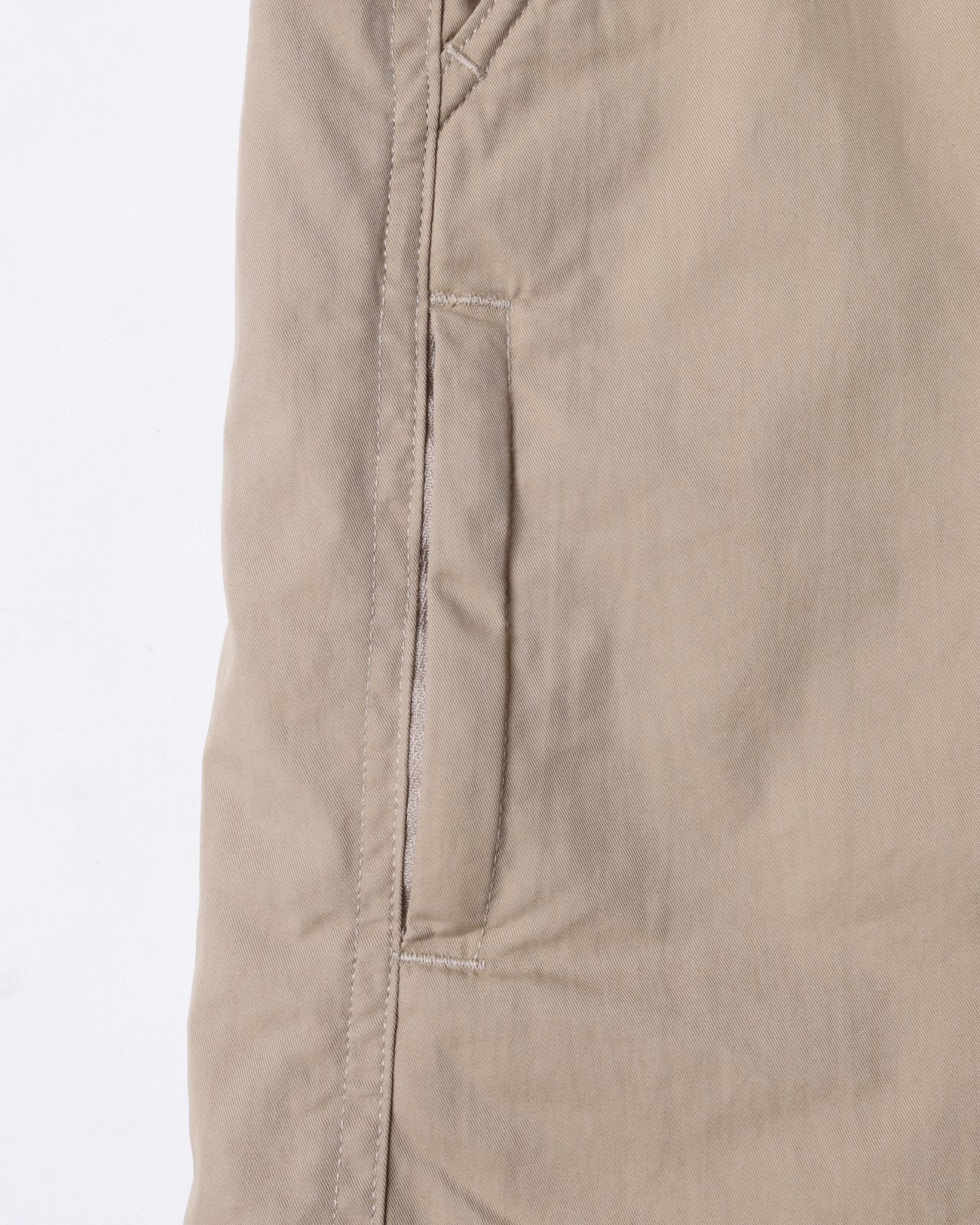 強度のあるコットンナイロンのツイルを使用し、薄い中綿を入れたチノパン。