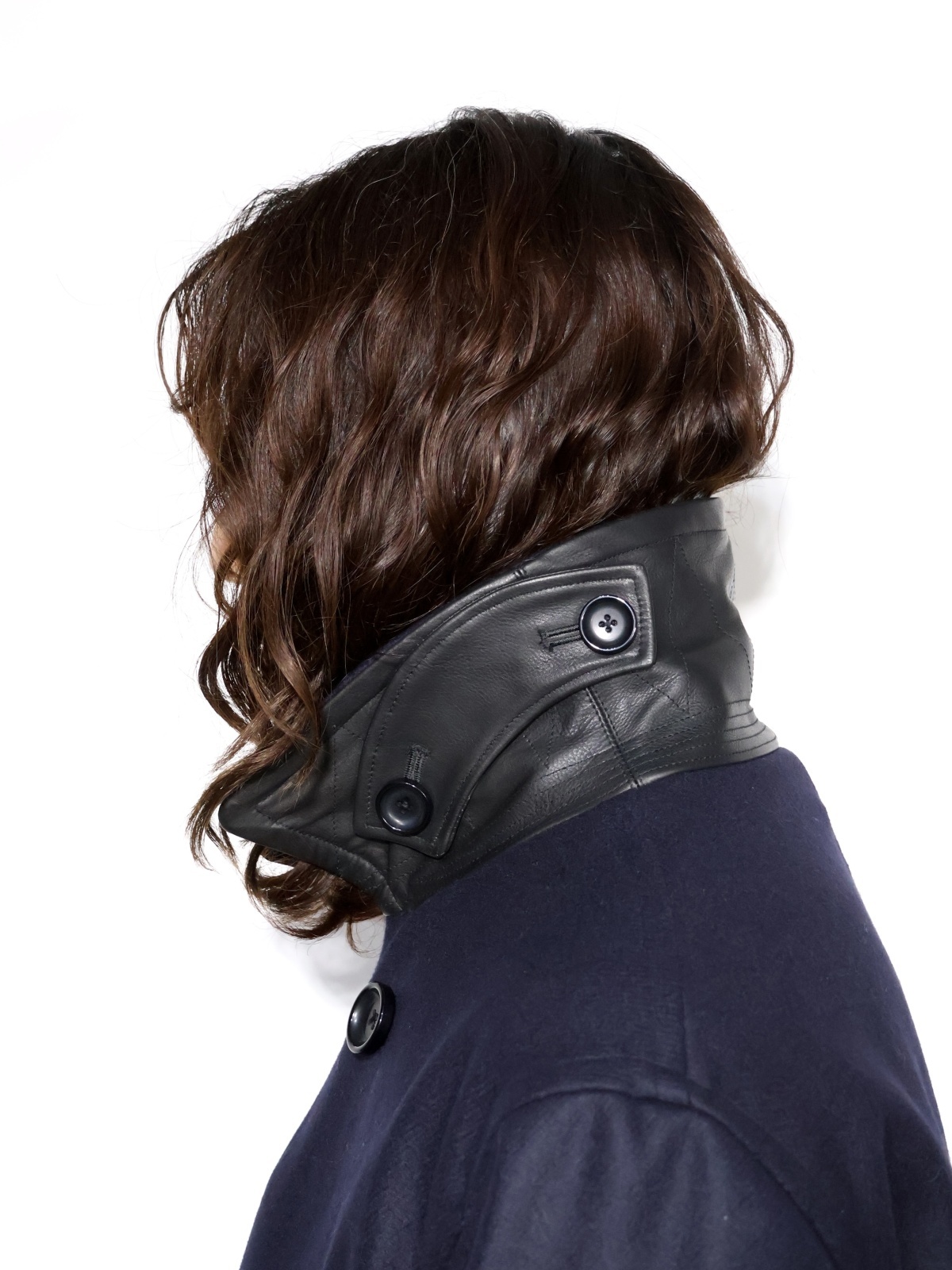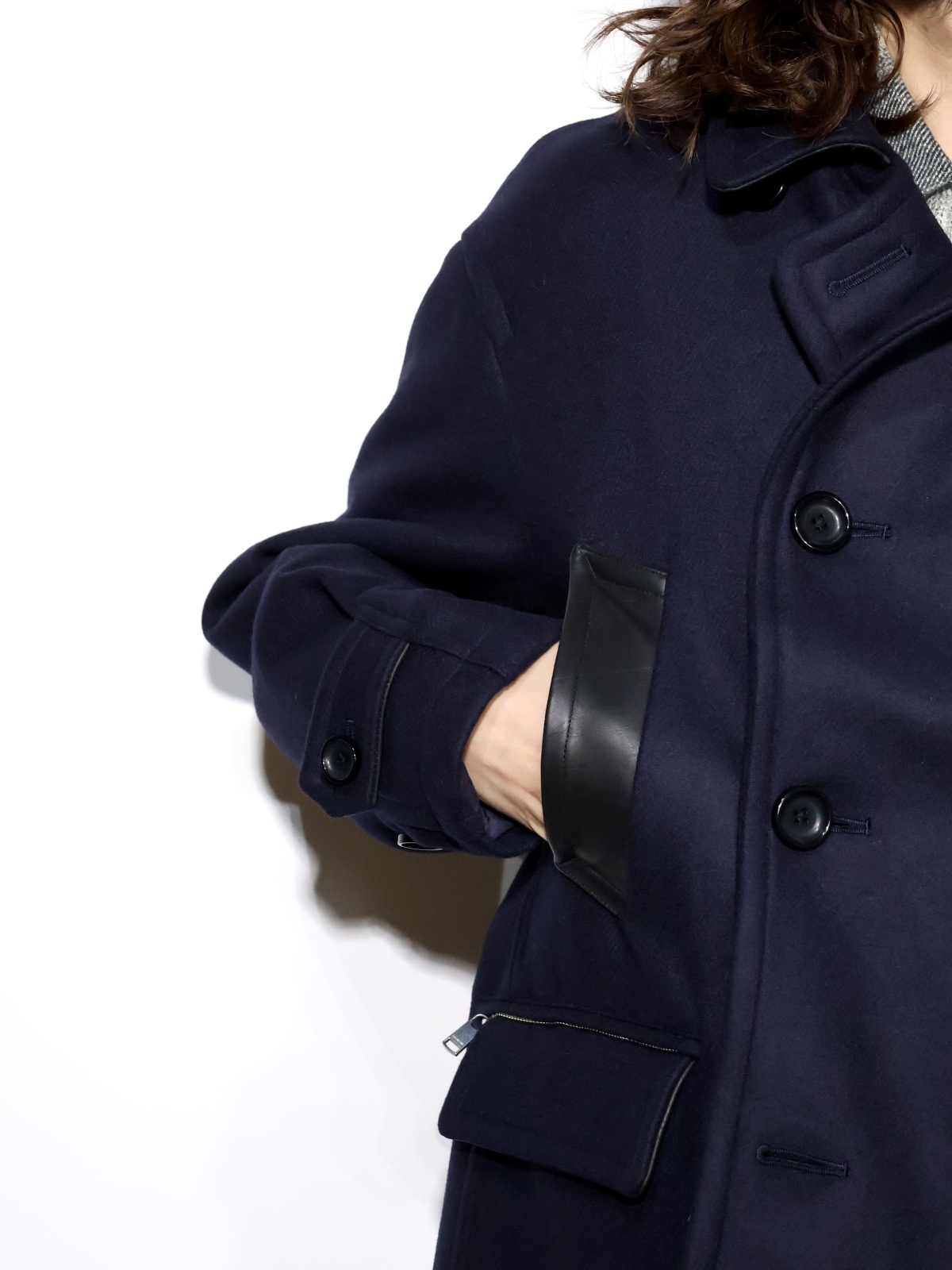 サイドポケットと襟裏にレザーを配したデザインが特徴。