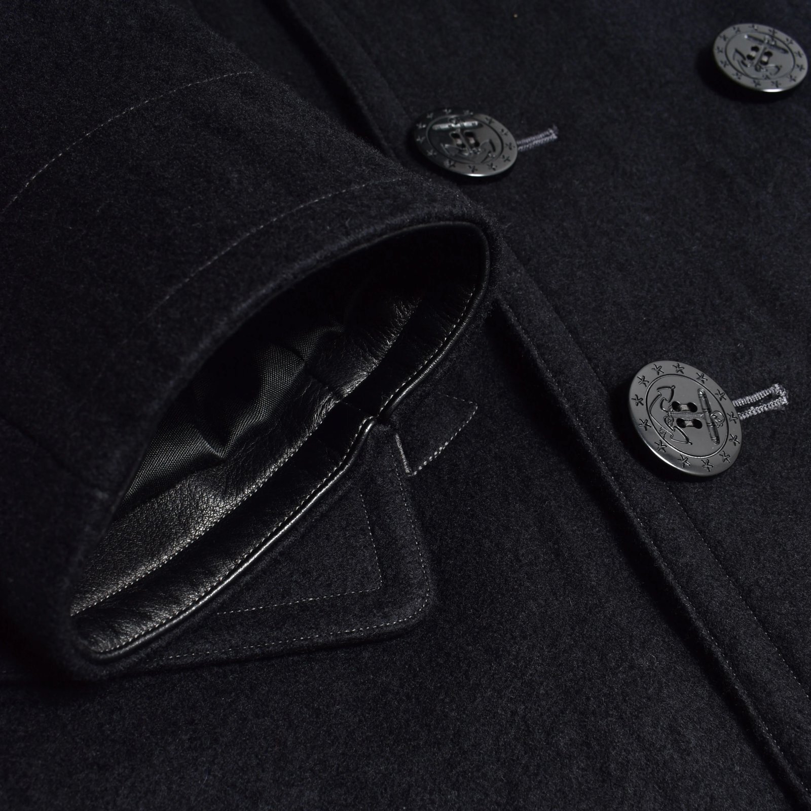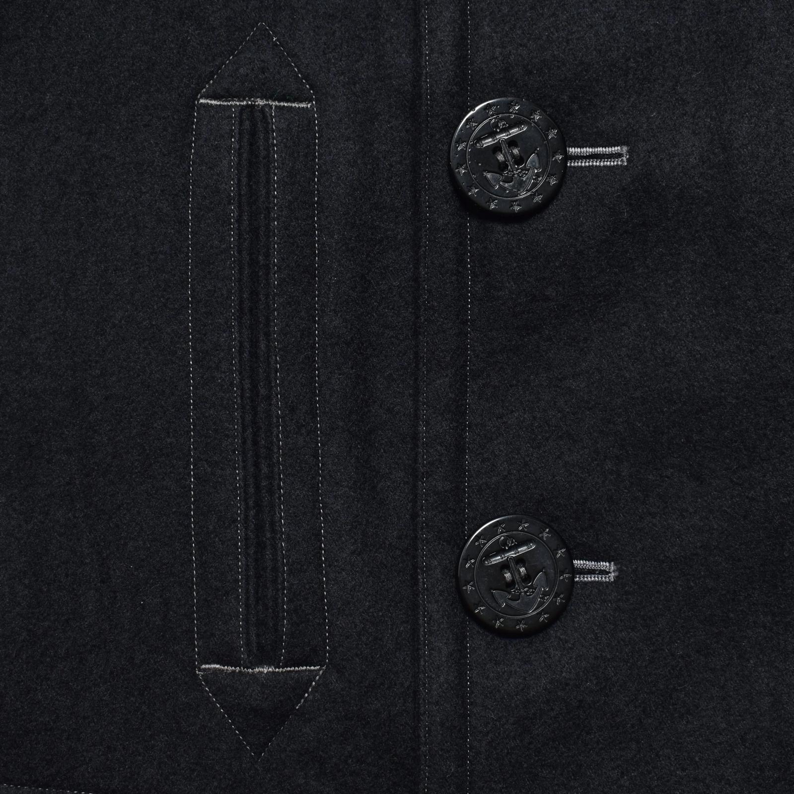 経糸にロープブラック糸、緯糸にブラックウール糸を使用しデニムとして織り上げた後に、本格的な縮絨と起毛加工を施してまるで本物のメルトンの様な質感に仕上げたさせたオリジナルブラックウールデニムメルトンを採用。