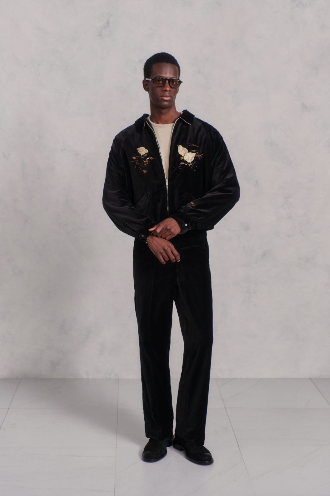 日本の伝統的なテクニックに倣い、古き良き美しい日本の風景を刺繍したジップブルゾン。