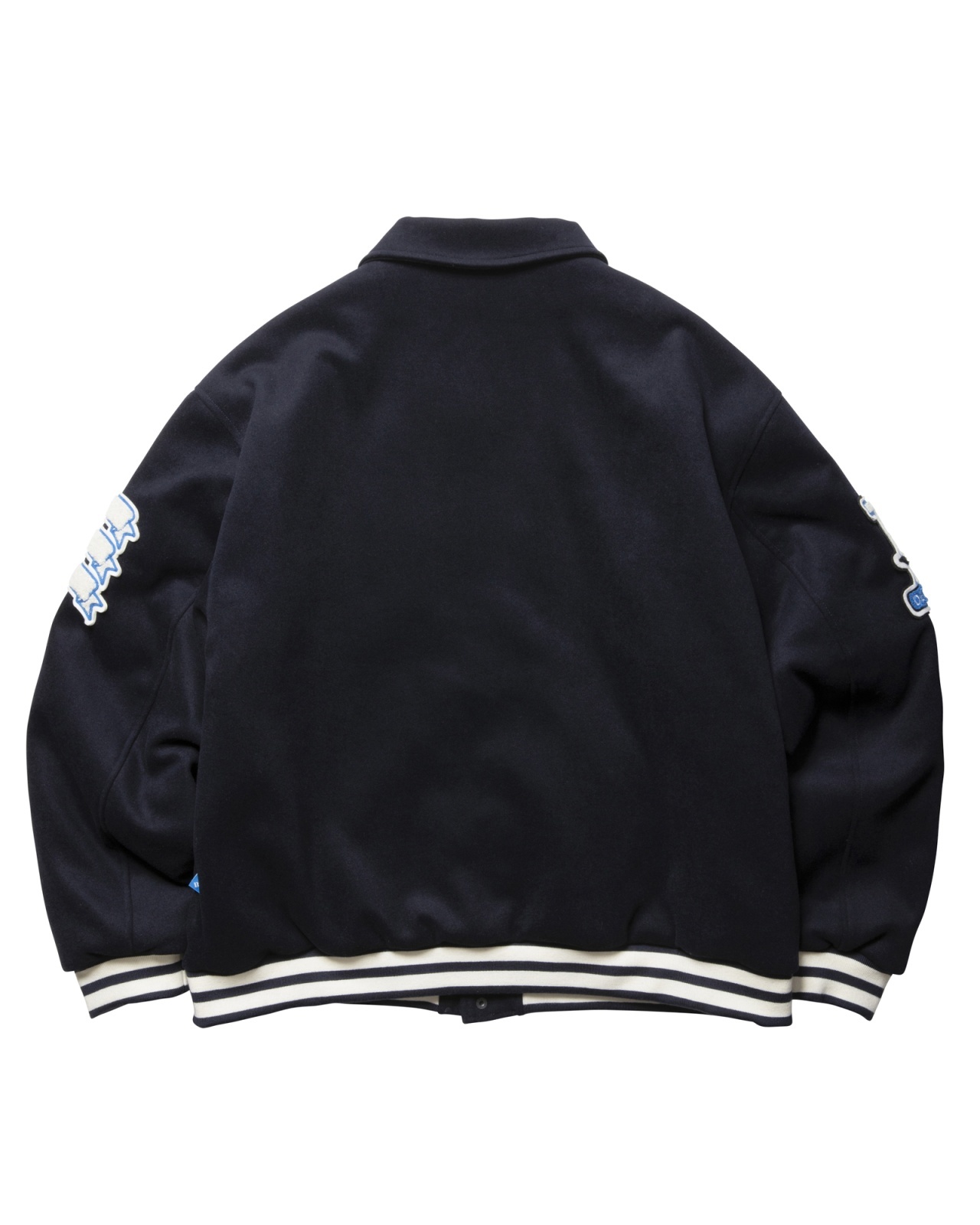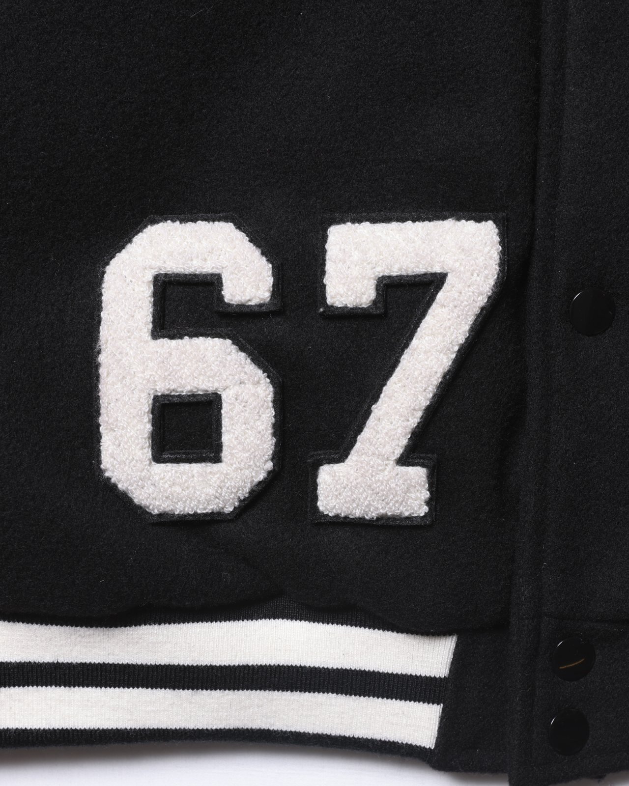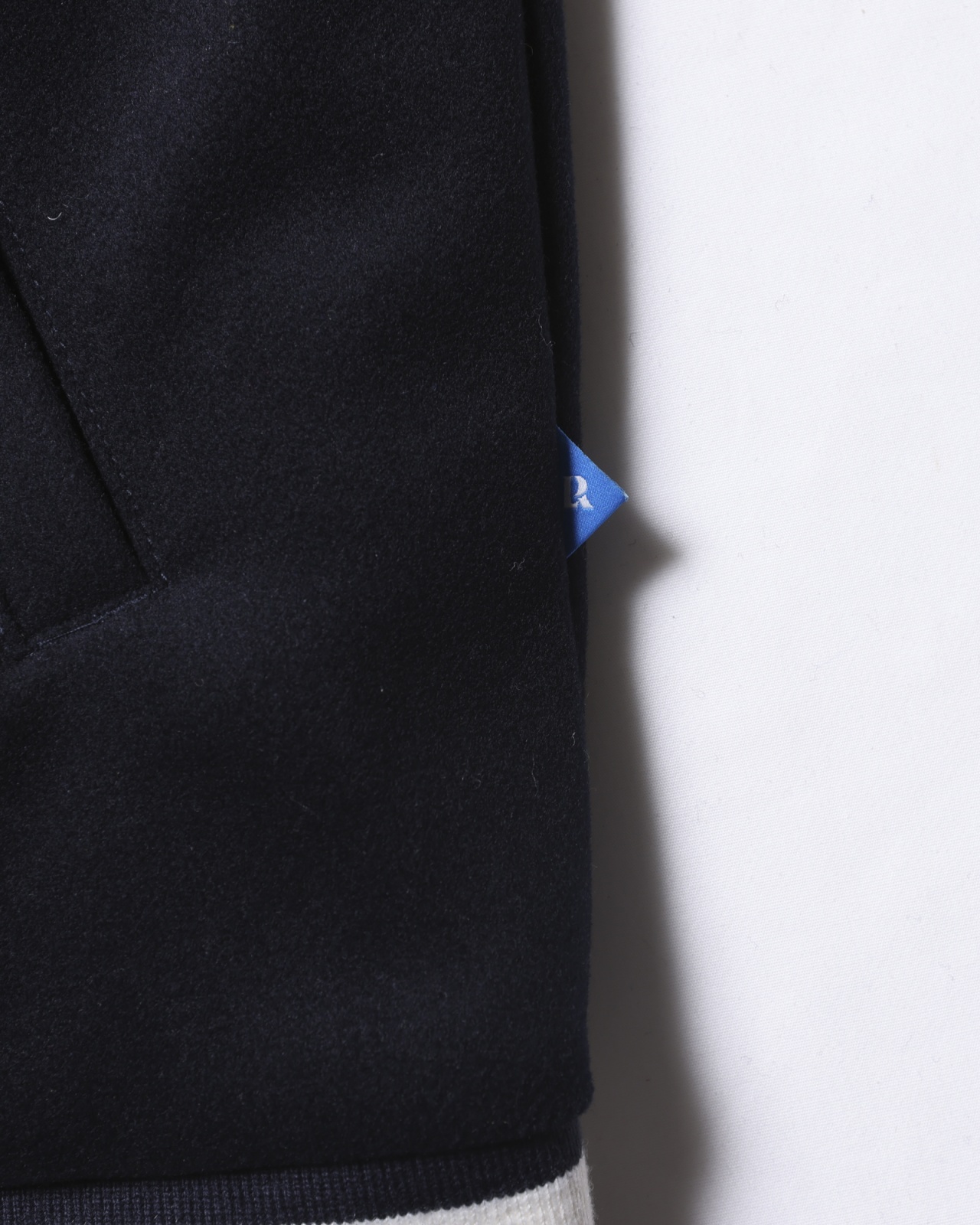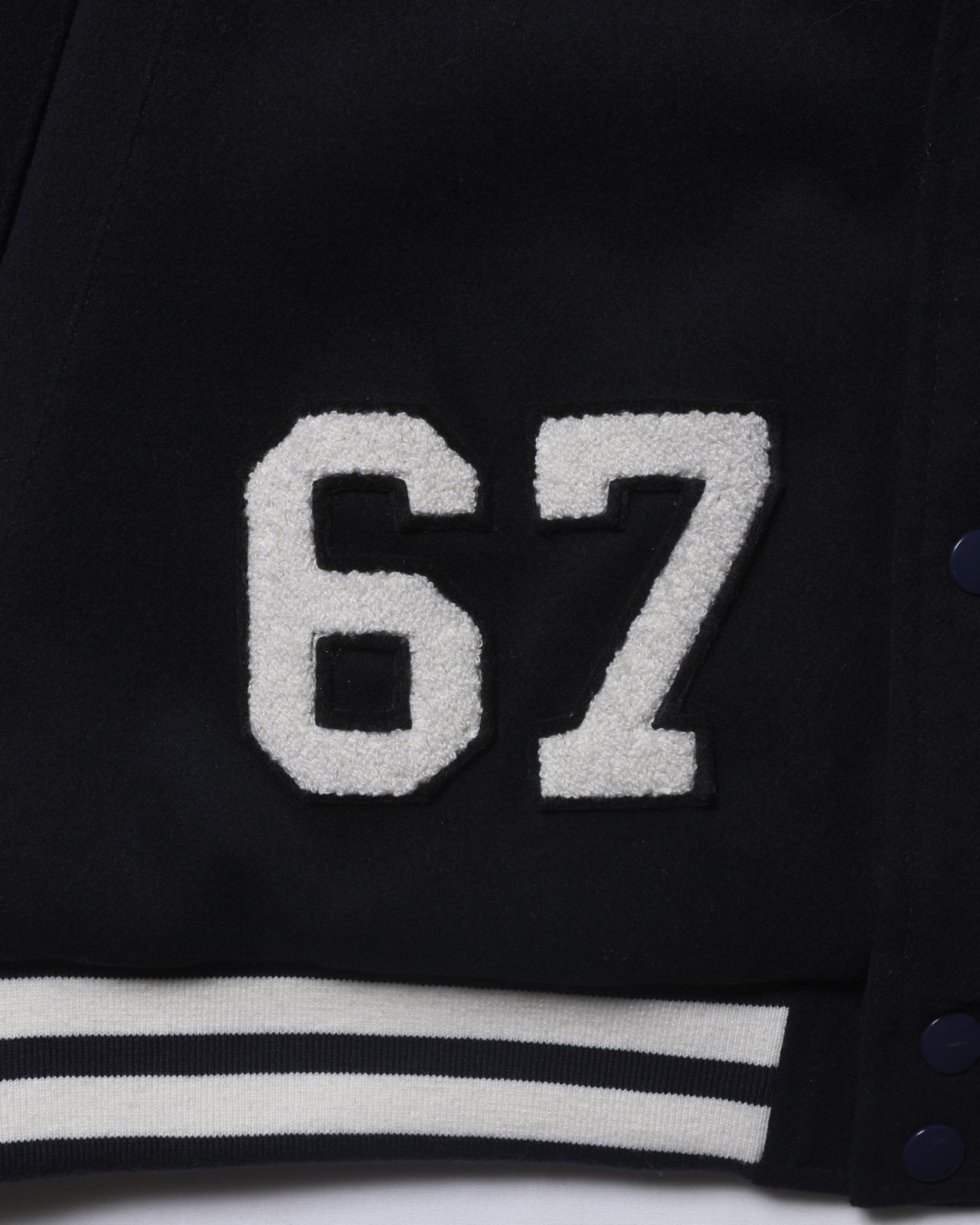 随所に帆施されたワッペンやチェーン刺繍等、本格的な仕様のヴァ―シティジャケットに仕上げています。